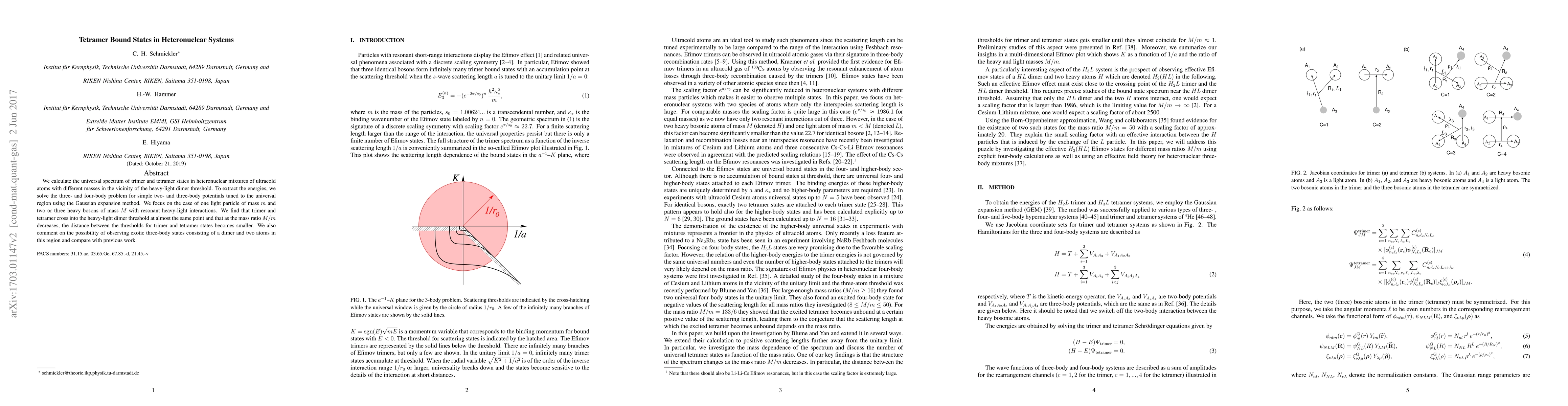 This paper investigates the universal spectrum of trimer and tetramer states in heteronuclear mixtures of ultracold atoms near the heavy-light dimer threshold, finding that their thresholds converge as the mass ratio decreases. The study uses the Gaussian expansion method to solve the three- and four-body problems for tuned potentials.