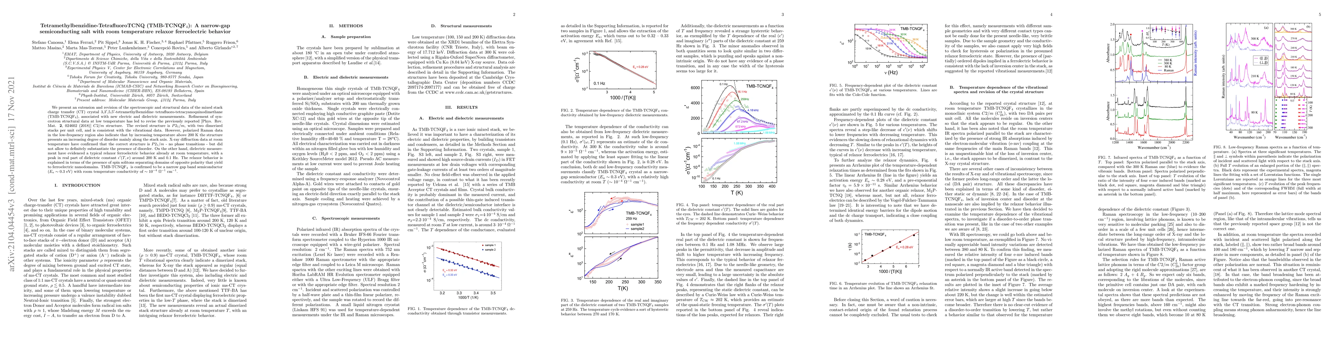 We present an extension and revision of the spectroscopic and structural data of the mixed stack charge transfer (CT) crystal 3,3$^\prime$,5,5$^\prime$-tetramethylbenzidine--tetrafluoro-tetracyanoquinodimethane (TMB-TCNQF4), associated with new electric and dielectric measurements. Refinement of syncrotron structural data at low temperature has led to revise the previously reported [Phys. Rev. Mat. 2, 024602 (2018)] $C2/m$ structure. The revised structure is $P2_1/m$, with two dimerized stacks per unit cell, and is consistent with the vibrational data. However, polarized Raman data in the low-frequency region also indicate that by increasing temperature above 200 K the structure presents an increasing degree of disorder mainly along the stack axis. X-ray diffraction data at room temperature have confirmed that the correct structure is $P2_1/m$ -- no phase transitions -- but did not allow to definitely substantiate the presence of disorder. On the other hand, dielectric measurement have evidenced a typical relaxor ferroelectric behavior already at room temperature, with a peak in real part of dielectric constant $\epsilon'(T,\nu)$ around 200 K and 0.1 Hz. The relaxor behavior is explained in terms of the presence of spin solitons separating domains of opposite polarity that yield to ferroelectric nanodomains. TMB-TCNQF4 is confirmed to be a narrow gap band semiconductor ($E_a \sim 0.3$ eV) with room temperature conductivity of $\sim 10^{-4}~ \Omega^{-1}$ cm$^{-1}$.