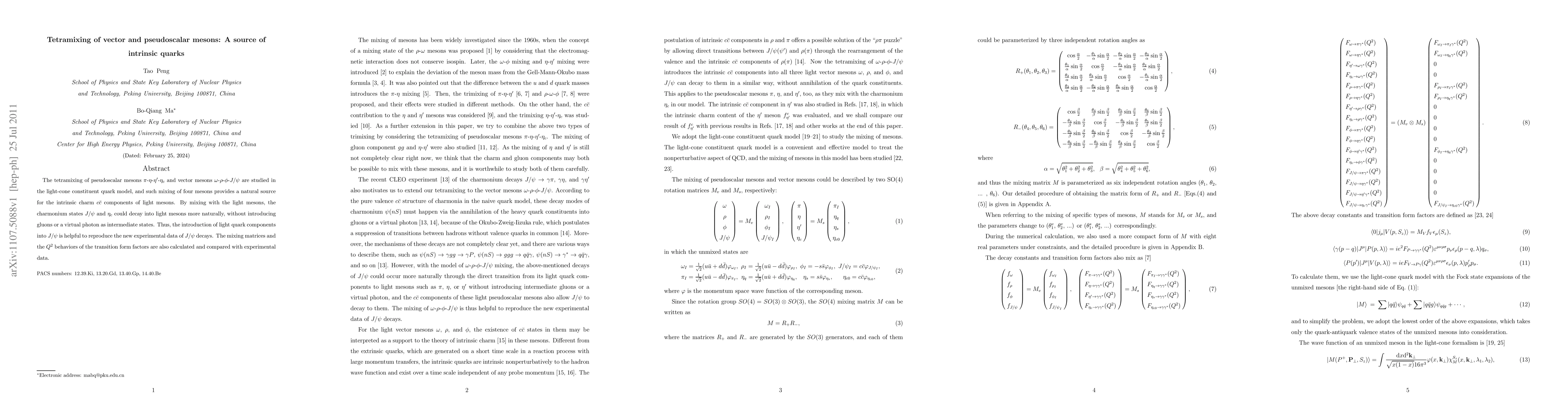 This study explores tetramixing of vector and pseudoscalar mesons as a natural source for intrinsic quarks, particularly charm components in light mesons, improving the reproduction of $J/ u$ decay data.