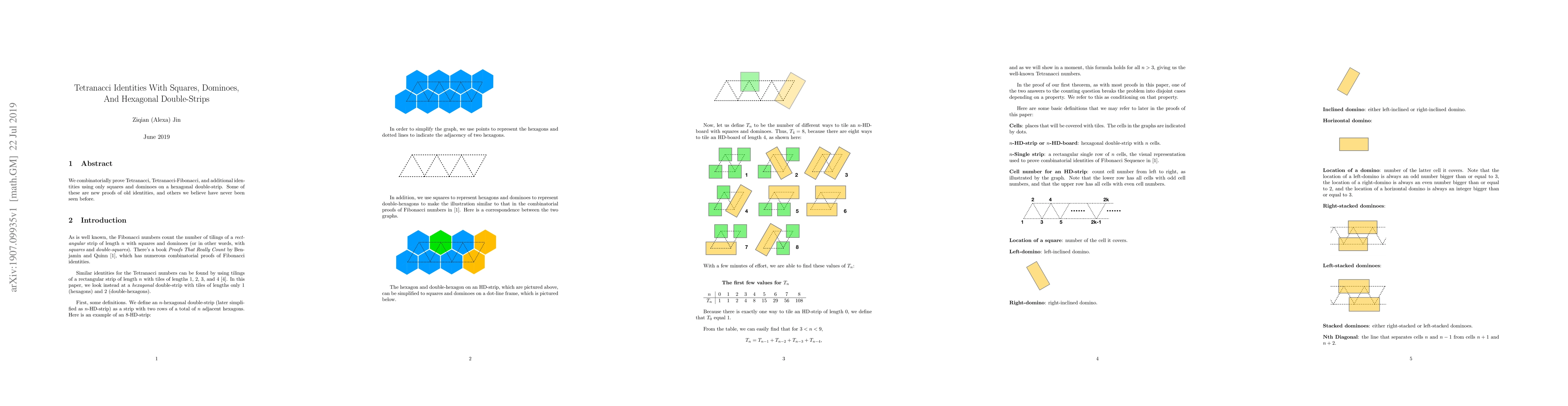 We combinatorially prove Tetranacci, Tetranacci-Fibonacci, and additional identities using only squares and dominoes on a hexagonal double-strip. Some of these are new proofs of old identities, and others we believe have never been seen before.