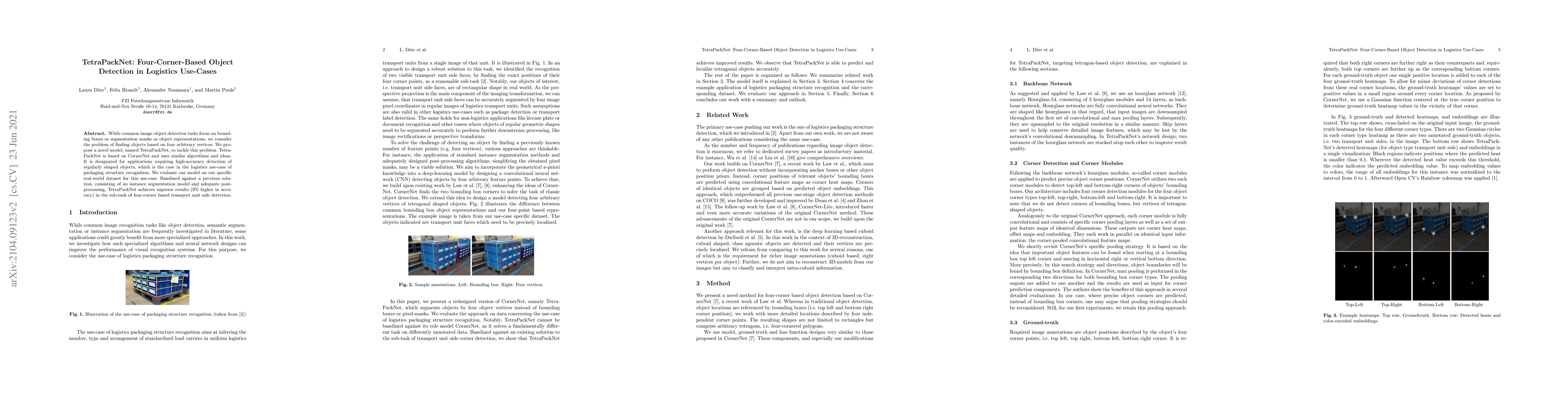 While common image object detection tasks focus on bounding boxes or segmentation masks as object representations, we consider the problem of finding objects based on four arbitrary vertices. We propose a novel model, named TetraPackNet, to tackle this problem. TetraPackNet is based on CornerNet and uses similar algorithms and ideas. It is designated for applications requiring high-accuracy detection of regularly shaped objects, which is the case in the logistics use-case of packaging structure recognition. We evaluate our model on our specific real-world dataset for this use-case. Baselined against a previous solution, consisting of a Mask R-CNN model and suitable post-processing steps, TetraPackNet achieves superior results (9% higher in accuracy) in the sub-task of four-corner based transport unit side detection.