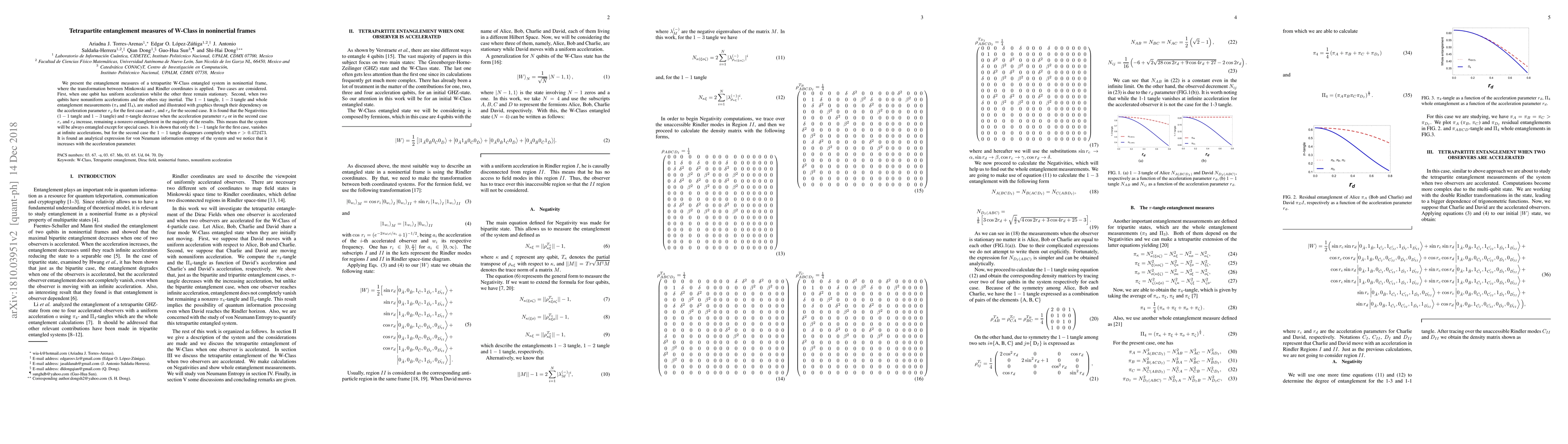 We present the entanglement measures of a tetrapartite W-Class entangled system in noninertial frame, where the transformation between Minkowski and Rindler coordinates is applied. Two cases are considered. First, when one qubit has uniform acceleration whilst the other three remain stationary. Second, when two qubits have nonuniform accelerations and the others stay inertial. The $1-1$ tangle, $1-3$ tangle and whole entanglement measurements ($\pi_4$ and $\Pi_4$), are studied and illustrated with graphics through their dependency on the acceleration parameter $r_d$ for the first case and $r_c$ and $r_d$ for the second case. It is found that the Negativities ($1-1$ tangle and $1-3$ tangle) and $\pi$-tangle decrease when the acceleration parameter $r_{d}$ or in the second case $r_c$ and $r_d$ increase, remaining a nonzero entanglement in the majority of the results. This means that the system will be always entangled except for special cases. It is shown that only the $1-1$ tangle for the first case, vanishes at infinite accelerations, but for the second case the $1-1$ tangle disappears completely when $r>0.472473$. It is found an analytical expression for von Neumann information entropy of the system and we notice that it increases with the acceleration parameter.