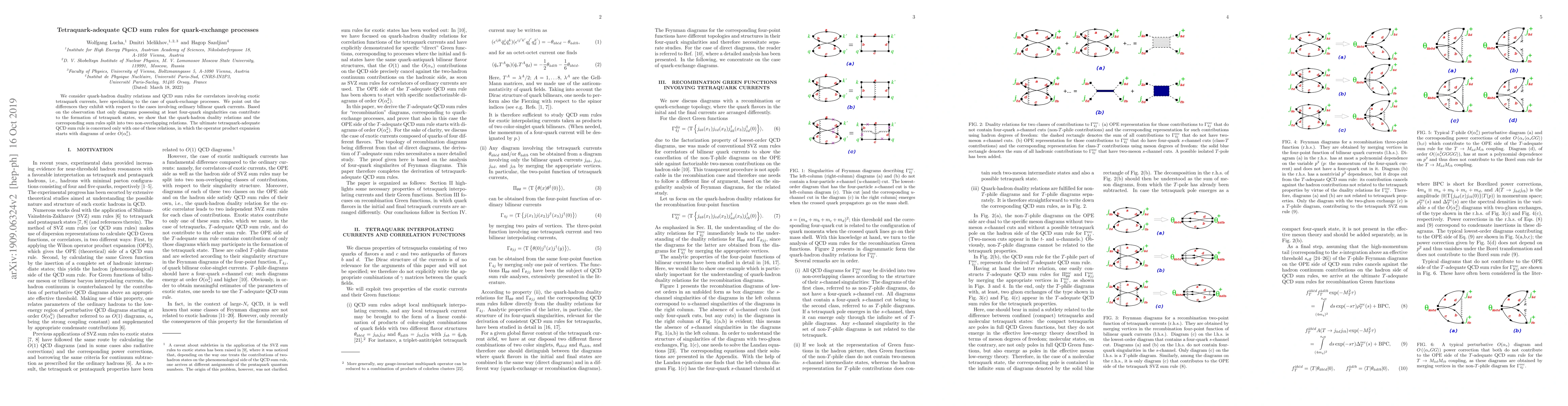 We consider quark-hadron duality relations and QCD sum rules for correlators involving exotic tetraquark currents, here specializing to the case of quark-exchange processes. We point out the differences they exhibit with respect to the cases involving ordinary bilinear quark currents. Based on the observation that only diagrams possessing at least four-quark singularities can contribute to the formation of tetraquark states, we show that the quark-hadron duality relations and the corresponding sum rules split into two non-overlapping relations. The ultimate tetraquark-adequate QCD sum rule is concerned only with one of these relations, in which the operator product expansion starts with diagrams of order $O(\alpha_s^2)$.