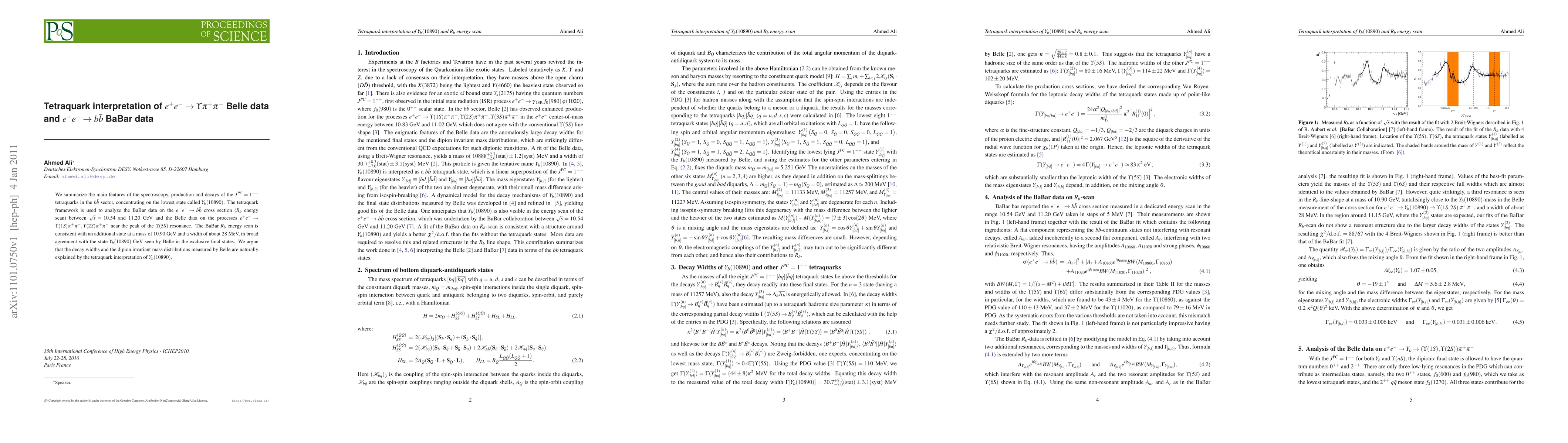 We summarize the main features of the spectroscopy, production and decays of the $J^{PC}=1^{--}$ tetraquarks in the $b\bar{b}$ sector, concentrating on the lowest state called $Y_b(10890)$. The tetraquark framework is used to analyze the BaBar data on the $e^+ e^- \to b\bar{b}$ cross section ($R_b$ energy scan) between $\sqrt{s}= 10.54$ and 11.20 GeV and the Belle data on the processes $e^+e^- \to \Upsilon(1S) \pi^+\pi^-,\Upsilon(2S) \pi^+\pi^-$ near the peak of the $\Upsilon(5S)$ resonance. The BaBar $R_b$ energy scan is consistent with an additional state at a mass of 10.90 GeV and a width of about 28 MeV, in broad agreement with the state $Y_b(10890)$ GeV seen by Belle in the exclusive final states. We argue that the decay widths and the dipion invariant mass distributions measured by Belle are naturally explained by the tetraquark interpretation of $Y_b(10890)$.