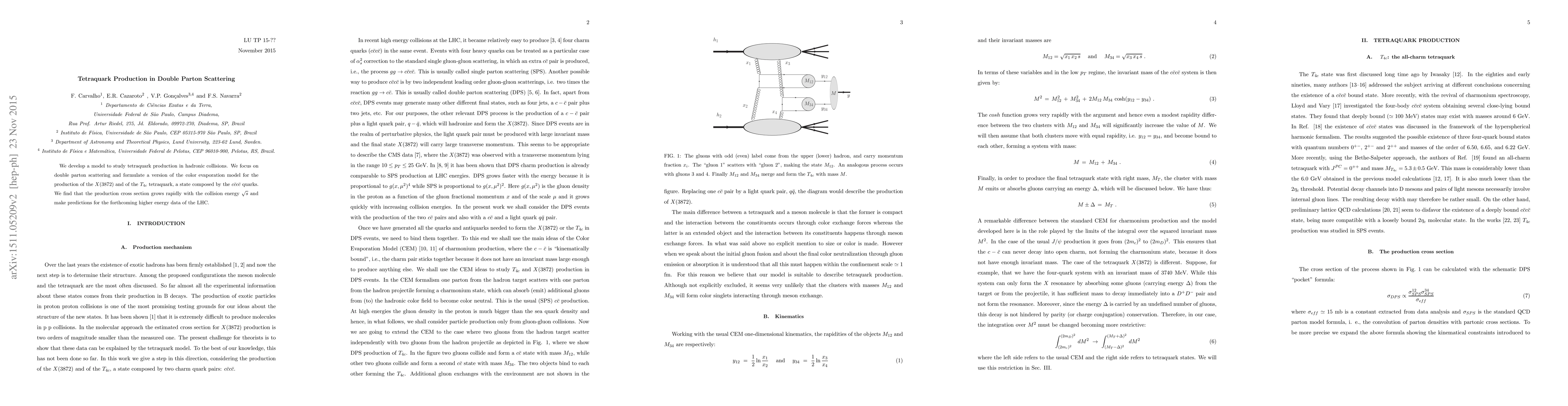 We develop a model to study tetraquark production in hadronic collisions. We focus on double parton scattering and formulate a version of the color evaporation model for the production of the $X(3872)$ and of the $T_{4c}$ tetraquark, a state composed by the $c \bar{c} c \bar{c}$ quarks. We find that the production cross section grows rapidly with the collision energy $\sqrt{s}$ and make predictions for the forthcoming higher energy data of the LHC.