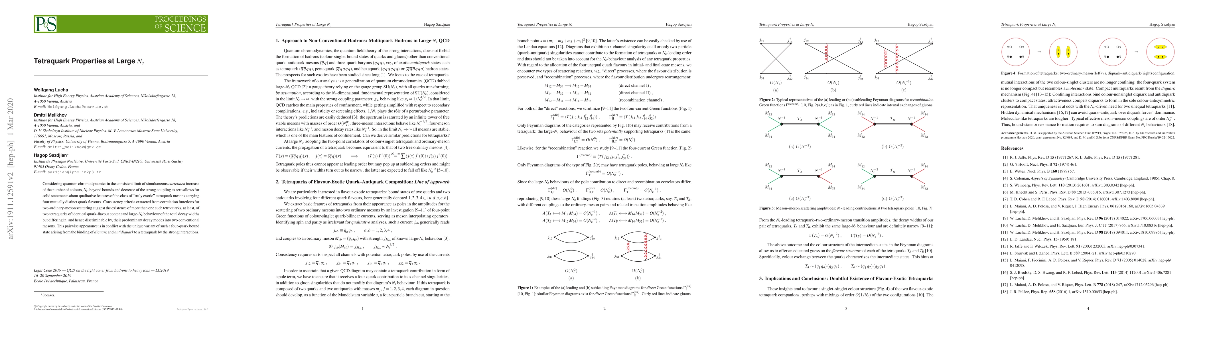 Considering quantum chromodynamics in the consistent limit of simultaneous correlated increase of the number of colours, $N_{\rm c}$, beyond bounds and decrease of the strong coupling to zero allows for solid statements about qualitative features of the class of "truly exotic" tetraquark mesons carrying four mutually distinct quark flavours. Consistency criteria extracted from correlation functions for two-ordinary-meson scattering suggest the existence of more than one such tetraquarks, at least, of two tetraquarks of identical quark-flavour content and large-$N_{\rm c}$ behaviour of the total decay widths but differing in, and hence discriminable by, their predominant decay modes into two conventional mesons. This pairwise appearance is in conflict with the unique variant of such a four-quark bound state arising from the binding of diquark and antidiquark to a tetraquark by the strong interactions.