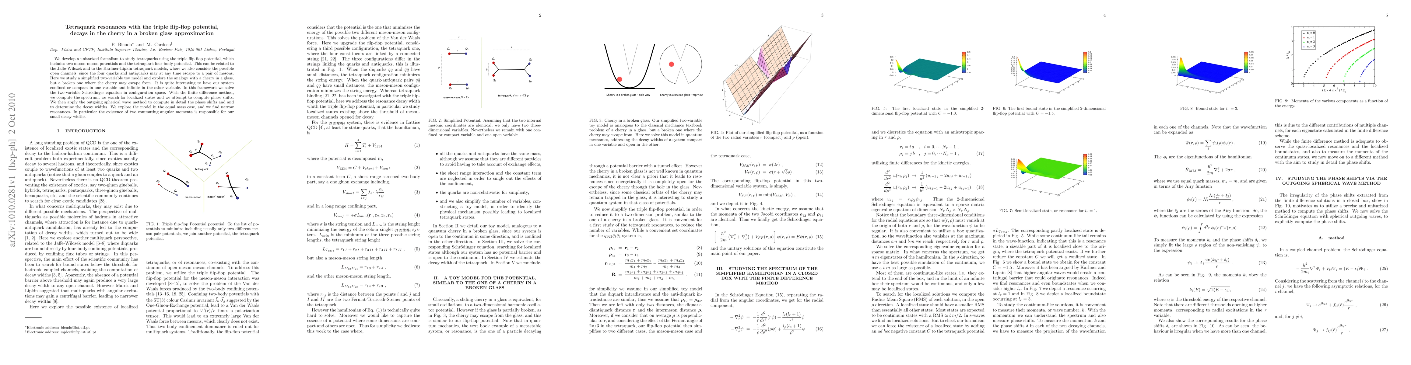 We develop a unitarized formalism to study tetraquarks using the triple flip-flop potential, which includes two meson-meson potentials and the tetraquark four-body potential. This can be related to the Jaffe-Wilczek and to the Karliner-Lipkin tetraquark models, where we also consider the possible open channels, since the four quarks and antiquarks may at any time escape to a pair of mesons. Here we study a simplified two-variable toy model and explore the analogy with a cherry in a glass, but a broken one where the cherry may escape from. It is quite interesting to have our system confined or compact in one variable and infinite in the other variable. In this framework we solve the two-variable Schr\"odinger equation in configuration space. With the finite difference method, we compute the spectrum, we search for localized states and we attempt to compute phase shifts. We then apply the outgoing spherical wave method to compute in detail the phase shifts and and to determine the decay widths. We explore the model in the equal mass case, and we find narrow resonances. In particular the existence of two commuting angular momenta is responsible for our small decay widths.