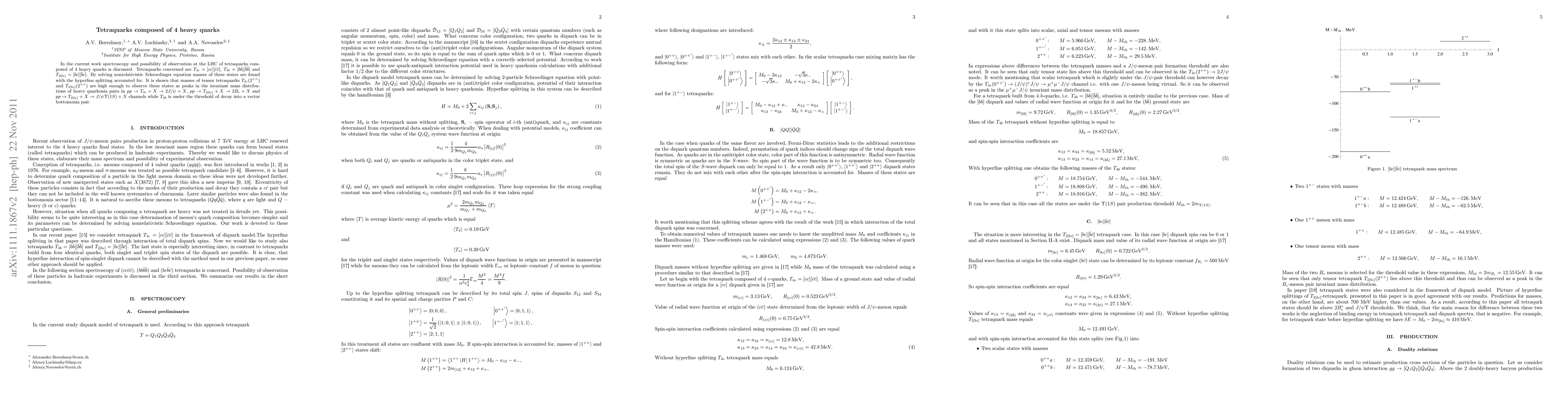 In the current work spectroscopy and possibility of observation at the LHC of tetraquarks composed of 4 heavy quarks is discussed. Tetraquarks concerned are T_{4c}=[cc][cc]$, T_{4b}=[bb][bb] and T_{2[bc]}=[bc][bc]. By solving nonrelativistic Schroedinger equation masses of these states are found with the hyperfine splitting accounted for. It is shown that masses of tensor tetraquarks T_{4c}(2++) and T_{2[bc]}(2++) are high enough to observe these states as peaks in the invariant mass distributions of heavy quarkonia pairs in pp -> T_{4c}+X -> 2J/\psi+X, pp -> T_{2[bc]}+X -> 2B_{c}+X and pp -> T_{2[bc]}+X -> J/\psi\Upsilon(1S)+X channels while T_{4b} is under the threshold of decay into a vector bottomonia pair.