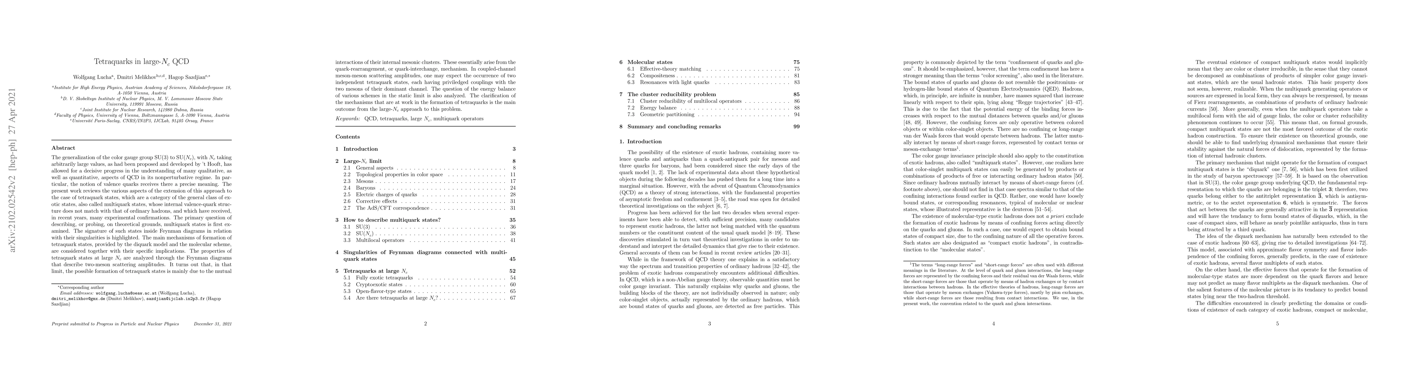This paper reviews the application of the large-$N_c$ QCD approach to tetraquark states, focusing on their formation mechanisms and properties. It highlights the quark-rearrangement mechanism as a primary driver for tetraquark formation in meson-meson scattering, suggesting the existence of two independent tetraquark states with specific couplings.