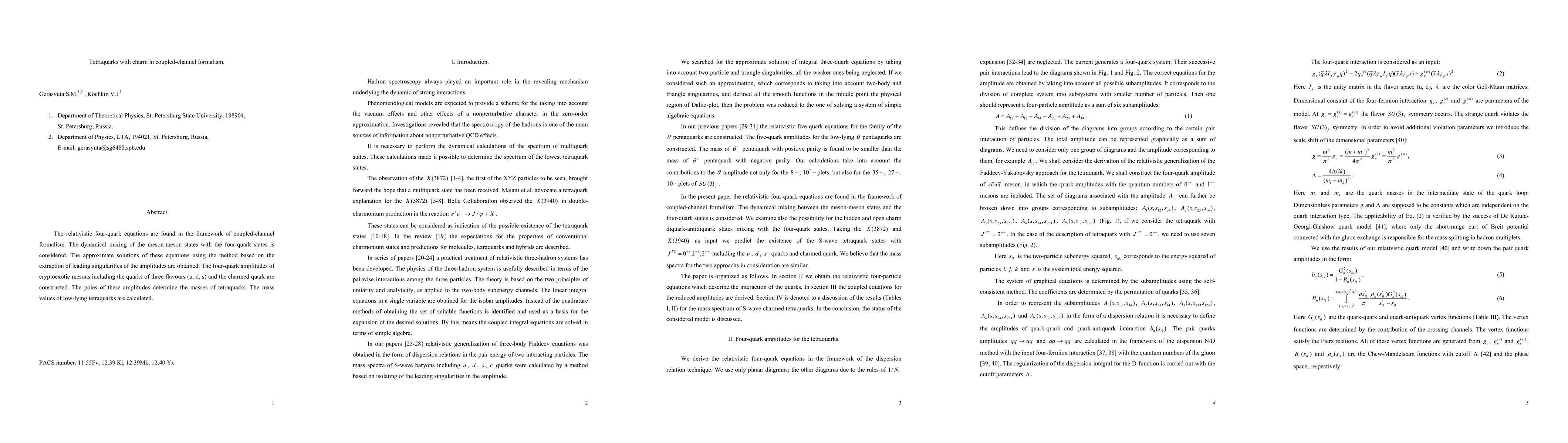 The relativistic four-quark equations are found in the framework of coupled-channel formalism. The dynamical mixing of the meson-meson states with the four-quark states is considered. The approximate solutions of these equations using the method based on the extraction of leading singularities of the amplitudes are obtained. The four-quark amplitudes of cryptoexotic mesons including the quarks of three flavours (u, d, s) and the charmed quark are constructed. The poles of these amplitudes determine the masses of tetraquarks. The mass values of low-lying tetraquarks are calculated.