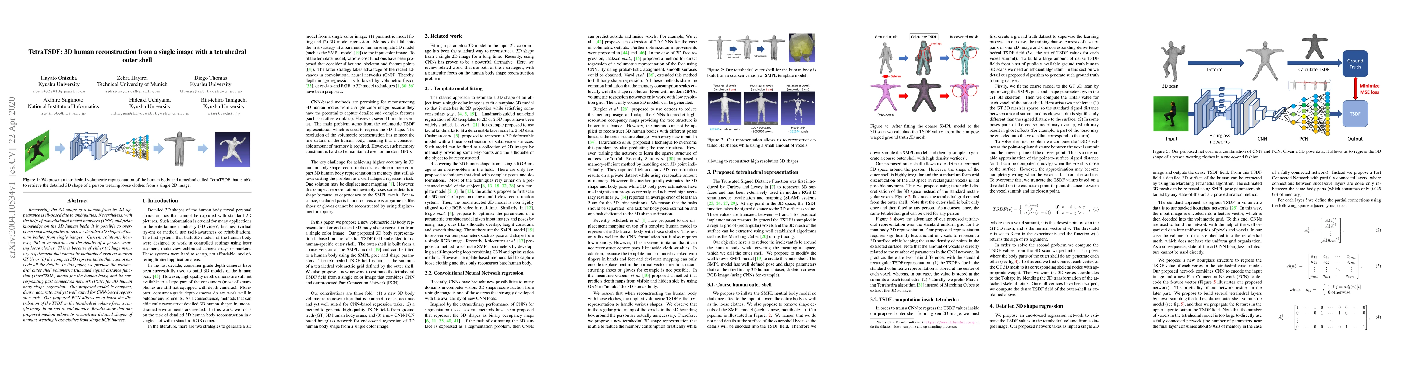 This paper proposes a tetrahedral outer shell volumetric truncated signed distance function (TetraTSDF) model for reconstructing detailed 3D shapes of humans from single images, overcoming memory and detail encoding limitations of existing methods. The part connection network (PCN) enables end-to-end learning of the TSDF distribution, successfully capturing the shapes of individuals wearing loose clothes.