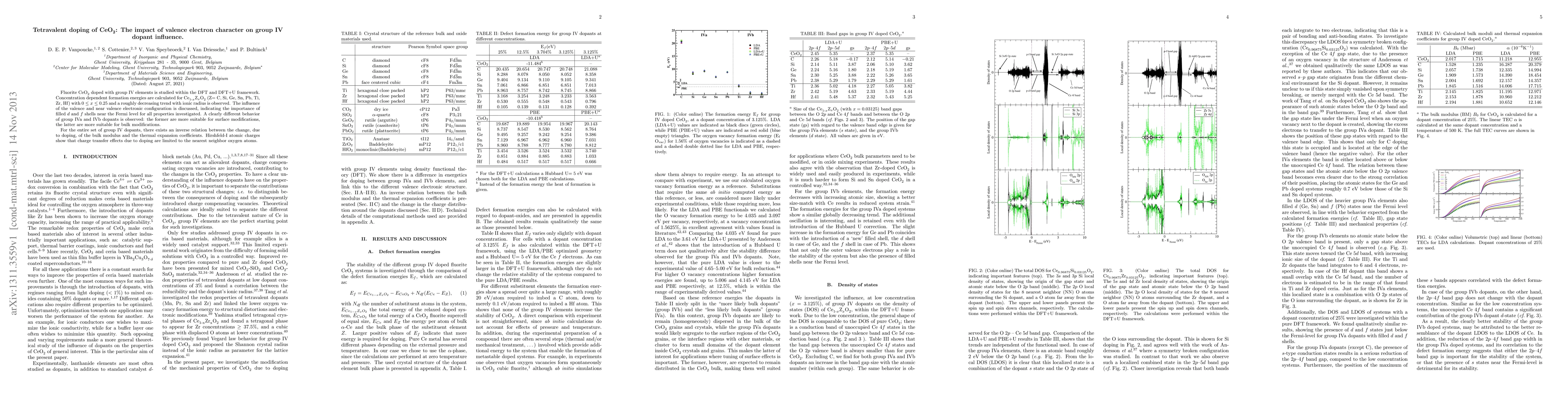 This study investigates the doping of CeO$_2$ with group IV elements using DFT and DFT+U methods, revealing a concentration-dependent formation energy trend. The research highlights the significance of filled $d$ and $f$ shells near the Fermi level, and distinguishes between group IVa and IVb dopants, with the former favoring surface modifications and the latter for bulk modifications.