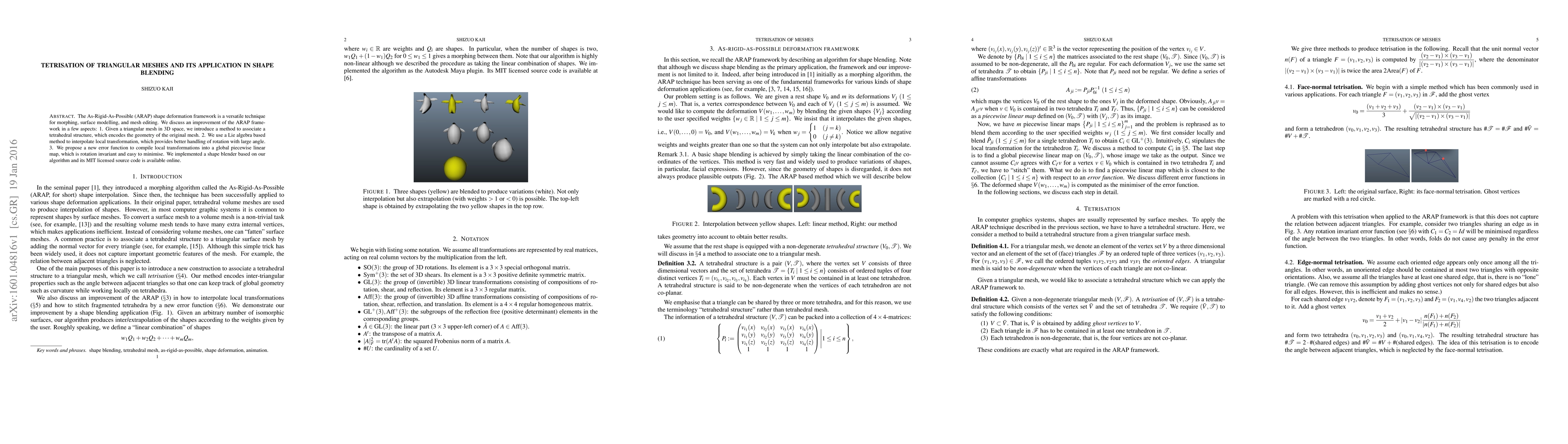 The As-Rigid-As-Possible (ARAP) shape deformation framework is a versatile technique for morphing, surface modelling, and mesh editing. We discuss an improvement of the ARAP framework in a few aspects: 1. Given a triangular mesh in 3D space, we introduce a method to associate a tetrahedral structure, which encodes the geometry of the original mesh. 2. We use a Lie algebra based method to interpolate local transformation, which provides better handling of rotation with large angle. 3. We propose a new error function to compile local transformations into a global piecewise linear map, which is rotation invariant and easy to minimise. We implemented a shape blender based on our algorithm and its MIT licensed source code is available online.