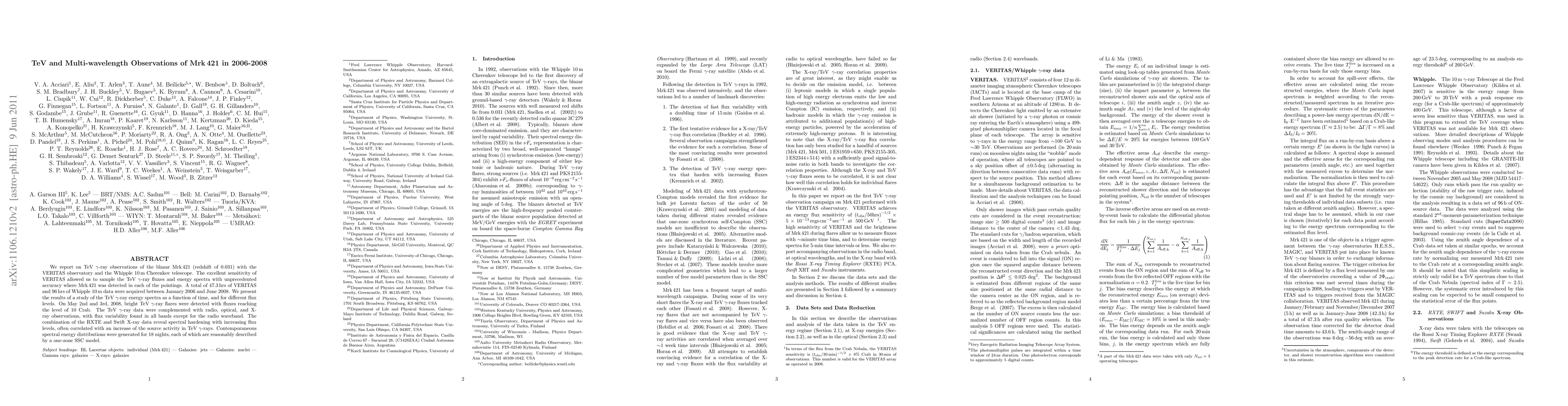 The study observed Mrk 421, a blazar, in TeV gamma-rays using VERITAS and Whipple 10m telescopes from 2006-2008, detecting it with high accuracy. Bright TeV flares up to 10 Crab were noted in May 2008. Flux variability was seen in all bands except radio. X-ray data from RXTE and Swift showed hardening with increasing flux, correlating with TeV activity. Spectral energy distributions for 18 nights fit a one-zone SSC model.