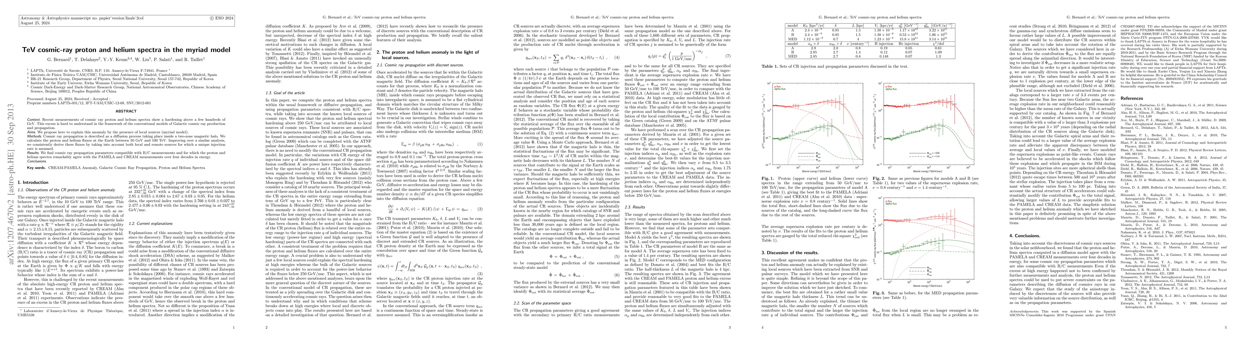 Recent measurements of cosmic ray proton and helium spectra show a hardening above a few hundreds of GeV. This excess is hard to understand in the framework of the conventional models of Galactic cosmic ray production and propagation. We propose here to explain this anomaly by the presence of local sources (myriad model). Cosmic ray propagation is described as a diffusion process taking place inside a two-zone magnetic halo. We calculate the proton and helium fluxes at the Earth between 50 GeV and 100 TeV. Improving over a similar analysis, we consistently derive these fluxes by taking into account both local and remote sources for which a unique injection rate is assumed. We find cosmic ray propagation parameters compatible with B/C measurements and for which the proton and helium spectra remarkably agree with the PAMELA and CREAM measurements over four decades in energy.