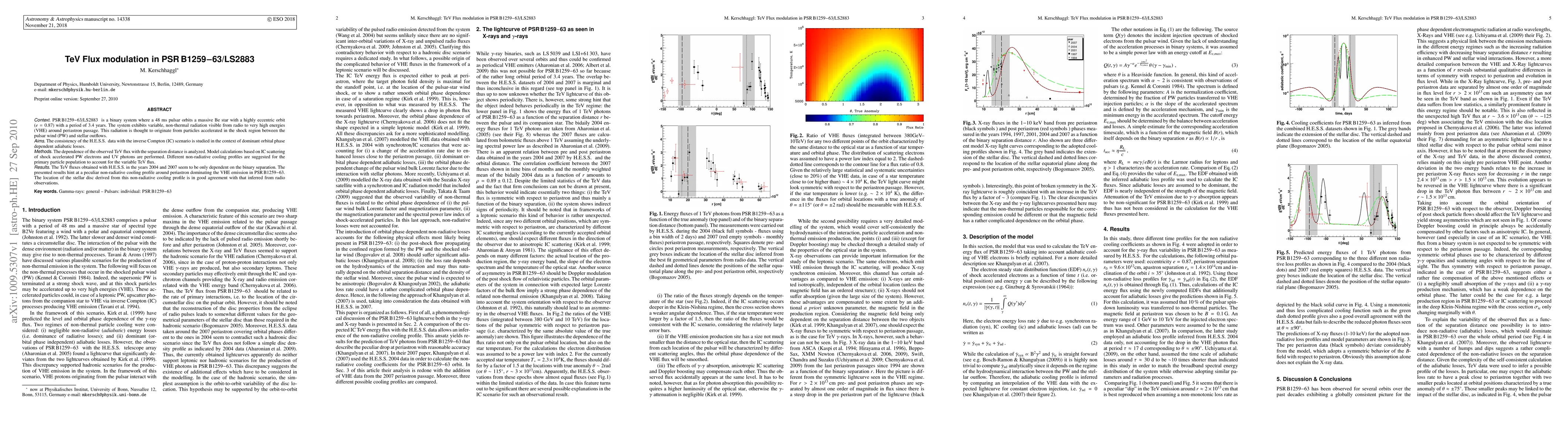 Researchers studied TeV flux modulation in PSR B1259-63/LS 2883, a binary system with a pulsar orbiting a massive Be star, and found that the TeV flux depends on the binary separation distance and suggests a non-radiative cooling profile around periastron.