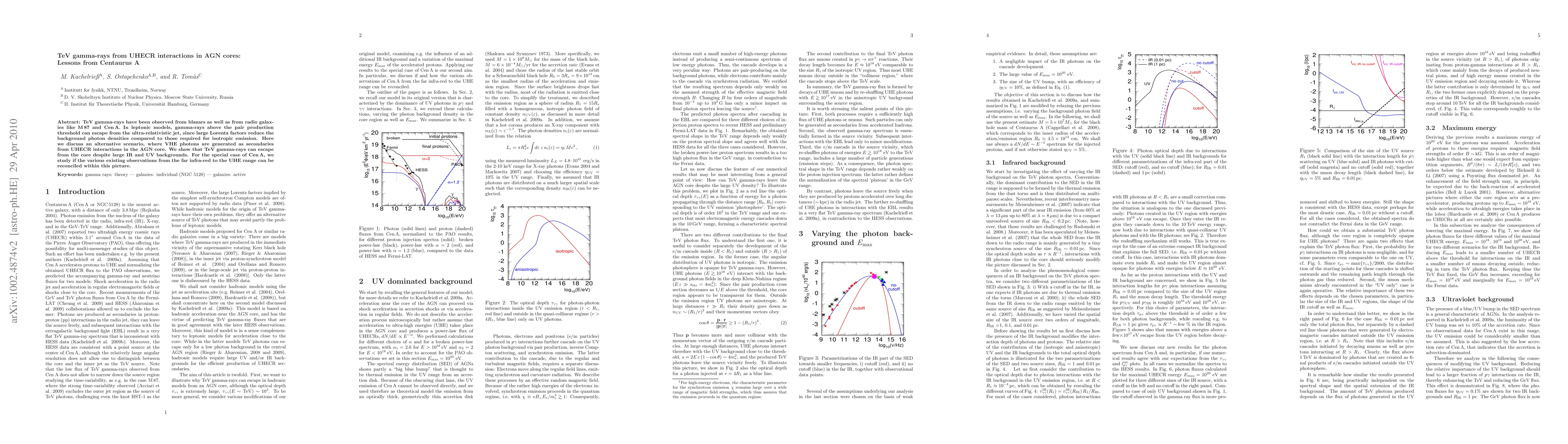 This paper explores an alternative scenario where TeV gamma-rays observed from AGN, including Centaurus A, are produced by UHECR interactions in the AGN core, rather than through leptonic models. It demonstrates that these gamma-rays can escape despite strong IR and UV backgrounds.
