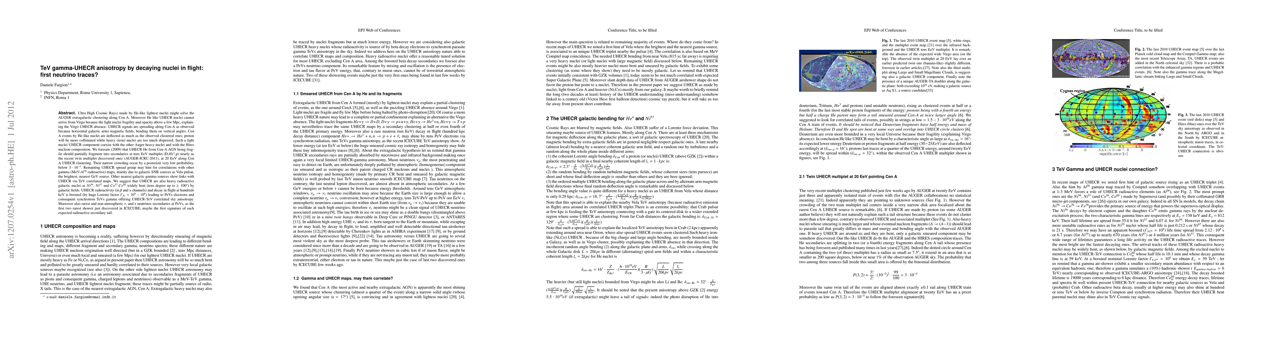 Ultra High Cosmic Rays) made by He-like lightest nuclei might solve the AUGER extragalactic clustering along Cen A. Moreover He like UHECR nuclei cannot arrive from Virgo because the light nuclei fragility and opacity above a few Mpc, explaining the Virgo UHECR absence. UHECR signals are spreading along Cen-A as observed because horizontal galactic arms magnetic fields, bending them on vertical angles. Cen A events by He-like nuclei are deflected as much as the observed clustered ones; proton will be more collimated while heavy (iron) nuclei are too much dispersed. Such a light nuclei UHECR component coexist with the other Auger heavy nuclei and with the Hires nucleon composition. Remaining UHECR spread group may hint for correlations with other gamma (MeV-Al^{26} radioactive) maps, mainly due to galactic SNR sources as Vela pulsar, the brightest, nearest GeV source. Other nearest galactic gamma sources show links with UHECR via TeV correlated maps. We suggest that UHECR are also heavy radioactive galactic nuclei as Ni^{56}, Ni^{57} and Co^{60} widely bent by galactic fields. UHECR radioactivity (in $\beta$ and $\gamma$ channels) and decay in flight at hundreds keV is boosted (by huge Lorentz factor (nearly a billion) leading to PeVs electrons and consequent synchrotron TeVs gamma offering UHECR-TeV correlated sky anisotropy. Moreover also rarest and non-atmospheric electron and tau neutrinos secondaries at PeVs, as the first two rarest shower just discovered in ICECUBE, maybe the first signature of such expected radioactive secondary tail.