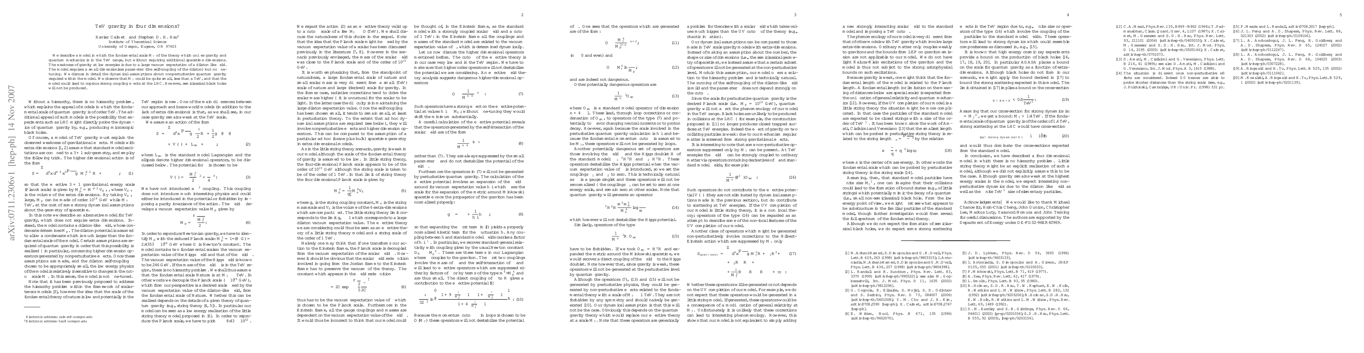 We describe a model in which the fundamental scale M_\star of the theory which unifies gravity and quantum mechanics is in the TeV range, but without requiring additional spacetime dimensions. The weakness of gravity at low energies is due to a large vacuum expectation of a dilaton like field. The model requires a small dimensionless parameter (the self-coupling of the dilaton) but no fine-tuning. We discuss in detail the dynamical assumptions about nonperturbative quantum gravity required within the model. We observe that M_\star could be quite small, less than a TeV, and that the model could lead to copious strong coupling effects at the LHC. However, semiclassical black holes will not be produced.