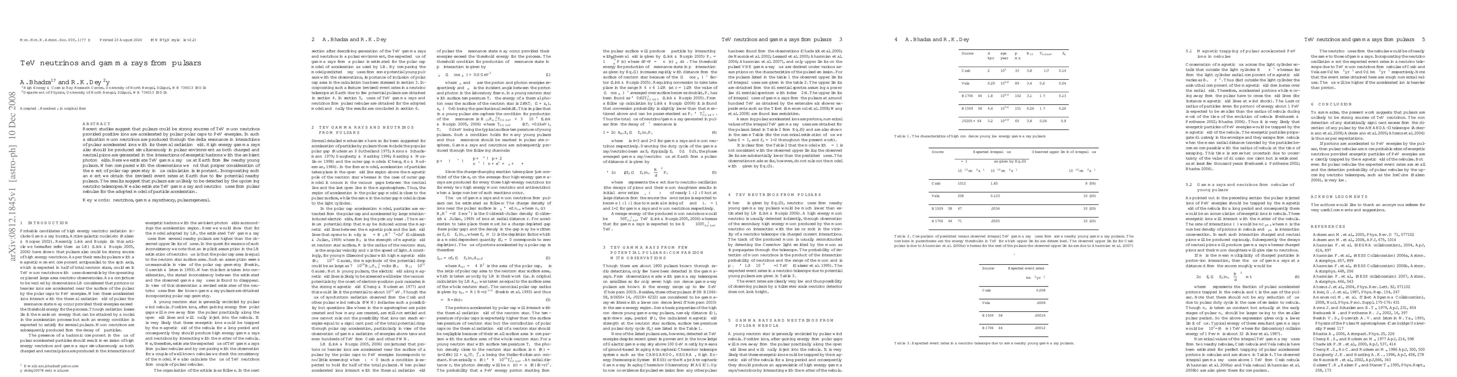 This paper investigates the potential for pulsars to emit TeV muon neutrinos and gamma rays, suggesting that these particles arise from the acceleration of positive ions in pulsar polar caps. The study revises TeV gamma ray flux estimates from nearby pulsars, considering the polar cap geometry, and concludes that pulsars are unlikely to be detected by future neutrino telescopes.
