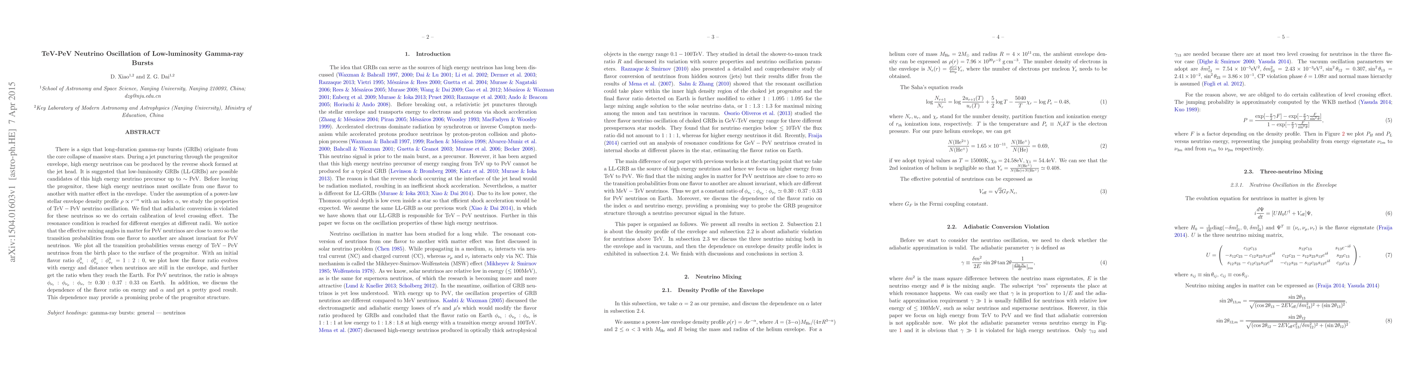 This paper investigates the oscillation of TeV-PeV neutrinos produced in low-luminosity gamma-ray bursts (LL-GRBs) as they traverse the progenitor star's envelope, finding that the transition probabilities for PeV neutrinos remain nearly invariant due to small effective mixing angles. The study concludes that the neutrino flavor ratio at Earth is relatively constant for PeV neutrinos, providing a potential probe of the progenitor structure.