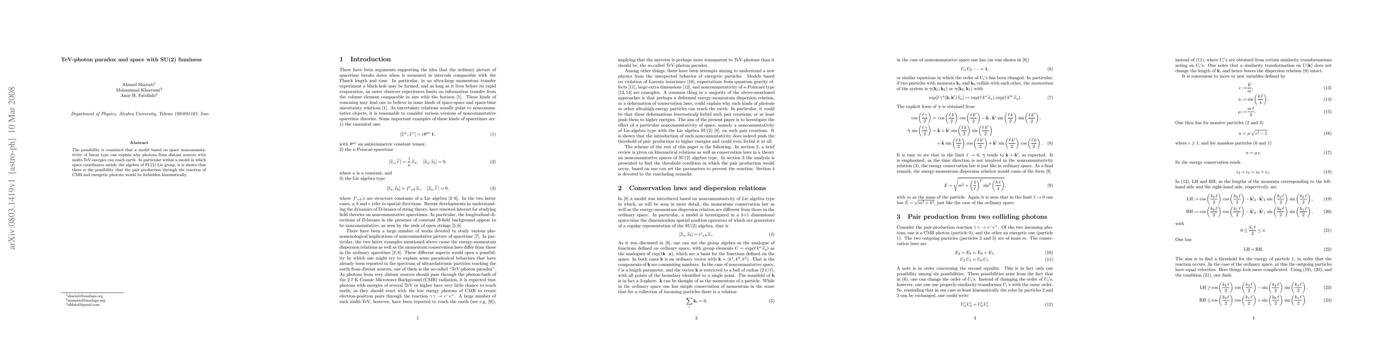 The possibility is examined that a model based on space noncommutativity of linear type can explain why photons from distant sources with multi-TeV energies can reach earth. In particular within a model in which space coordinates satisfy the algebra of SU(2) Lie group, it is shown that there is the possibility that the pair production through the reaction of CMB and energetic photons would be forbidden kinematically.