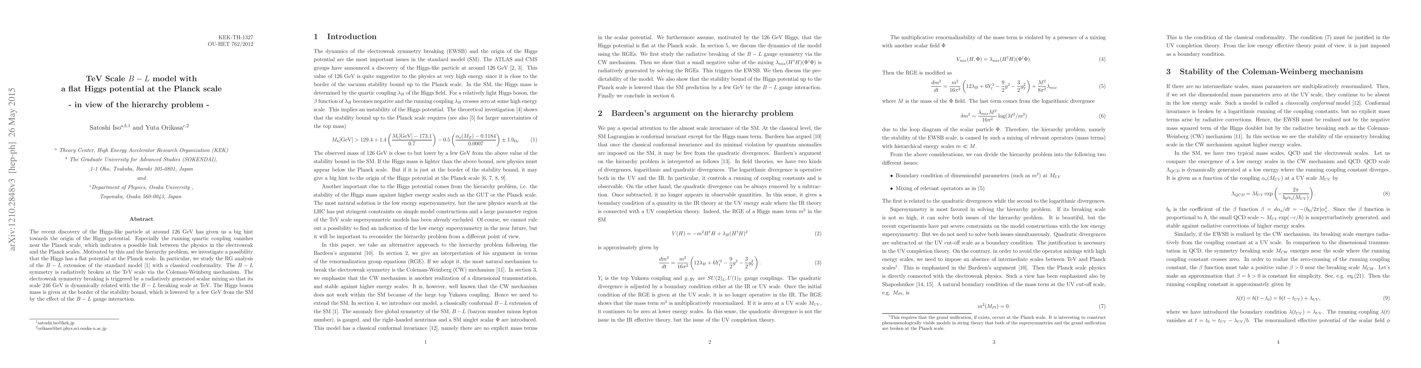This paper explores a TeV scale B-L model with a flat Higgs potential at the Planck scale to address the hierarchy problem. It employs RG analysis to show the B-L symmetry breaking at the TeV scale and links the electroweak symmetry breaking to the B-L breaking scale, resulting in a Higgs mass near the stability boundary.