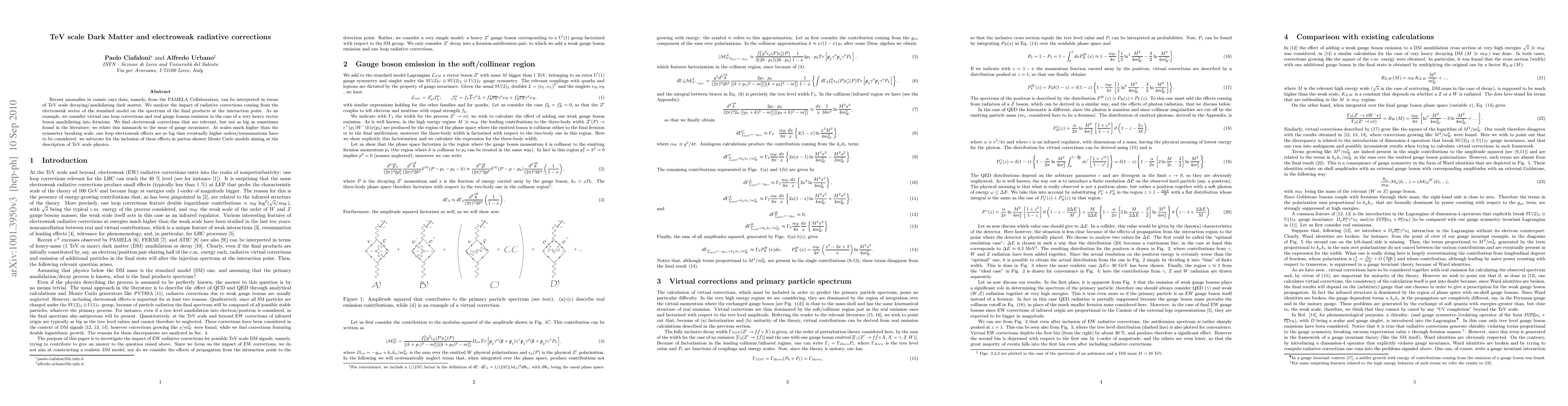 Recent anomalies in cosmic rays data, namely from the PAMELA collaboration, can be interpreted in terms of TeV scale decaying/annihilating Dark Matter. We analyze the impact of radiative corrections coming from the electroweak sector of the Standard Model on the spectrum of the final products at the interaction point. As an example, we consider virtual one loop corrections and real gauge bosons emission in the case of a very heavy vector boson annihilating into fermions. We show that the effect of electroweak corrections is relevant, but not as big as sometimes claimed in the literature. At such high scales, one loop electroweak effects are so big that eventually higher orders/resummations have to be considered: we advocate for the inclusion of these effects in parton shower Montecarlos aiming at the description of TeV scale physics.