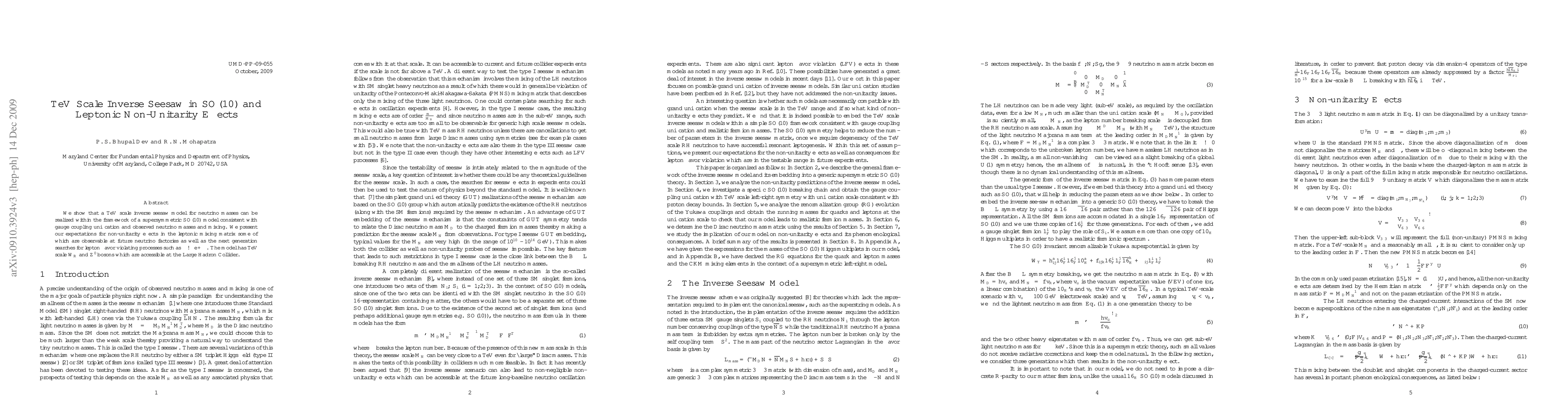 This paper proposes a TeV scale inverse seesaw model within a supersymmetric SO(10) framework, consistent with gauge unification and observed neutrino masses. It also explores leptonic non-unitarity effects potentially observable at future neutrino factories and searches for lepton flavor violation.