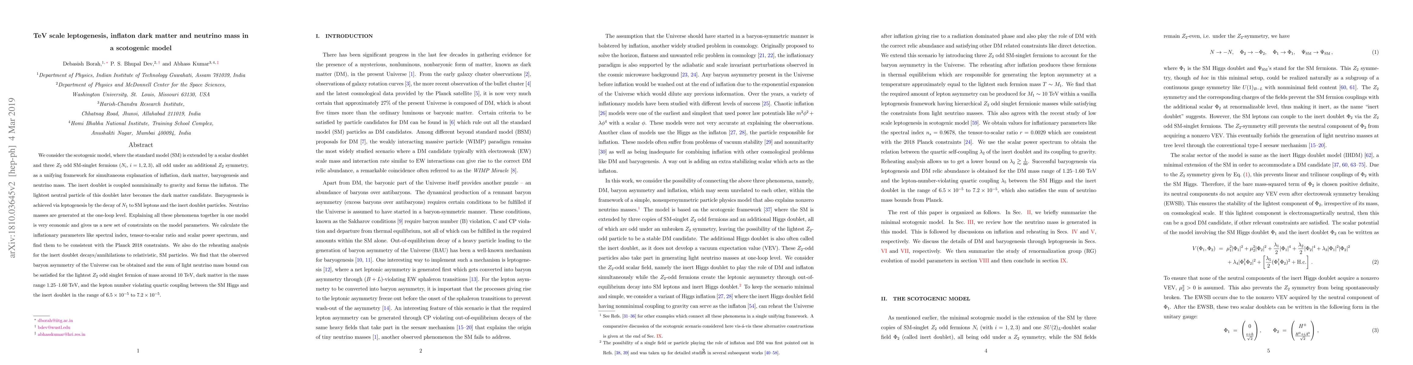 This paper explores a scotogenic model extending the Standard Model with a scalar doublet and three $Z_2$ odd fermions to explain inflation, dark matter, baryogenesis, and neutrino masses. The inert doublet serves as the inflaton and dark matter candidate, while leptogenesis via the decay of $N_1$ achieves baryogenesis, and neutrino masses arise at the one-loop level. The model parameters are constrained to be consistent with observational data and the observed baryon asymmetry.