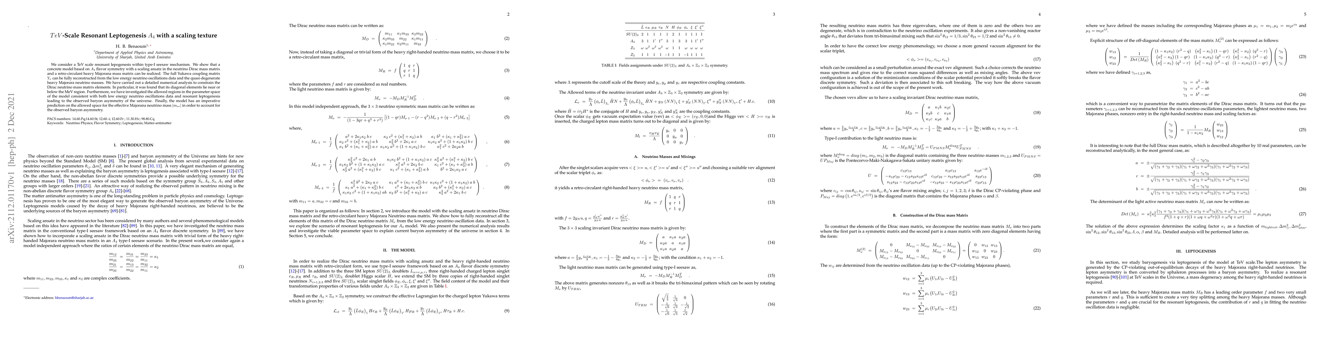 We consider a TeV scale resonant lepogenesis within type-I seesaw mechanism. We show that a concrete model based on $A_4$ flavor symmetry with a scaling ansatz in the neutrino Dirac mass matrix and a retro-circulant heavy Majorana mass matrix can be realized. The full Yukawa coupling matrix $Y_{\nu}$ can be fully reconstructed from the low energy neutrino oscillations data and the quasi-degenerate heavy Majorara neutrino masses. We have carried out a detailed numerical analysis to constrain the Dirac neutrino mass matrix elements. In particular, it was found that its diagonal elements lie near or below the MeV region. Furthermore, we have investigated the allowed regions in the parameter space of the model consistent with both low energy neutrino oscillations data and resonant leptogenesis leading to the observed baryon asymmetry of the universe. Finally, the model has an imperative prediction on the allowed space for the effective Majorana neutrino mass $|m_{ee}|$ in order to account for the observed baryon asymmetry.