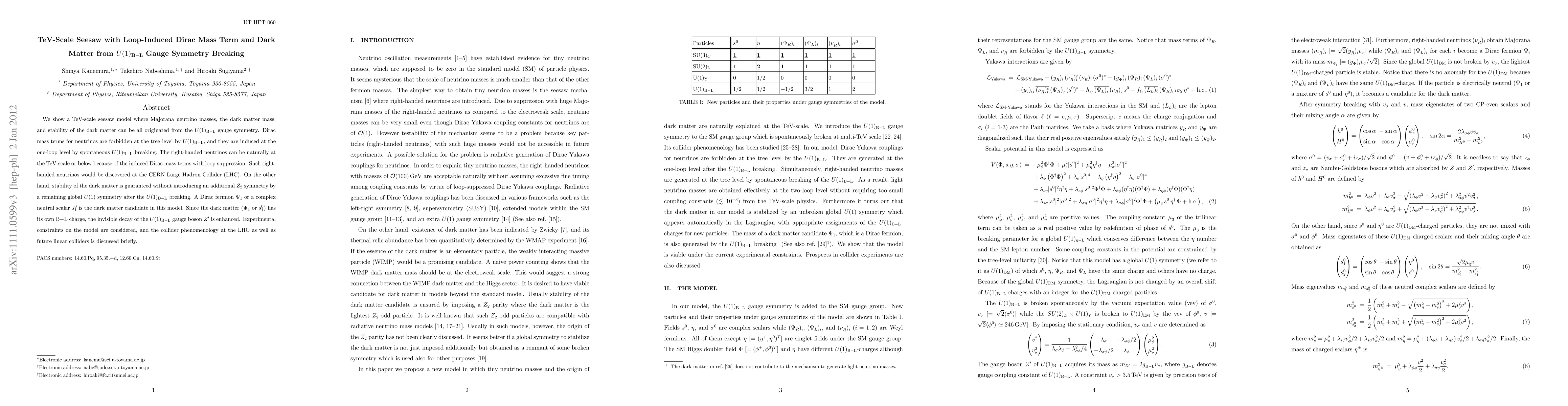 This paper proposes a TeV-scale seesaw model where Majorana neutrino masses and dark matter stability arise from U(1)_{B-L} gauge symmetry. The Dirac mass terms for neutrinos are loop-induced due to spontaneous U(1)_{B-L} breaking, allowing right-handed neutrinos to be at the TeV scale or lower. The dark matter candidate, either a Dirac fermion or a neutral scalar, is stable due to a residual U(1) symmetry.