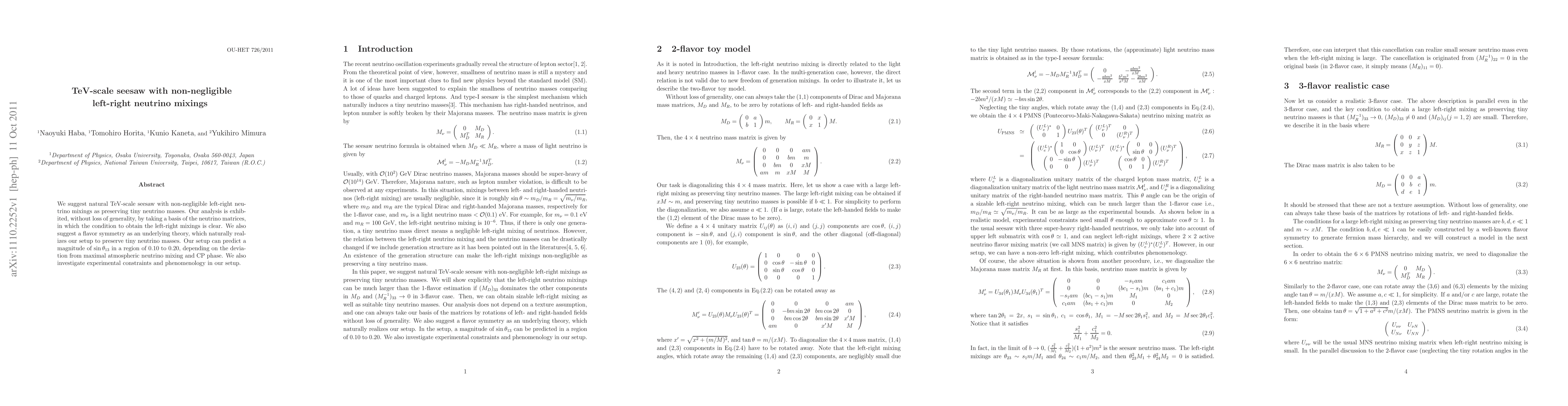 We suggest natural TeV-scale seesaw with non-negligible left-right neutrino mixings as preserving tiny neutrino masses. Our analysis is exhibited, without loss of generality, by taking a basis of the neutrino matrices, in which the condition to obtain the left-right mixings is clear. We also suggest a flavor symmetry as an underlying theory, which naturally realizes our setup to preserve tiny neutrino masses. Our setup can predict a magnitude of sin theta_13 in a region of 0.10 to 0.20, depending on the deviation from maximal atmospheric neutrino mixing and CP phase. We also investigate experimental constraints and phenomenology in our setup.