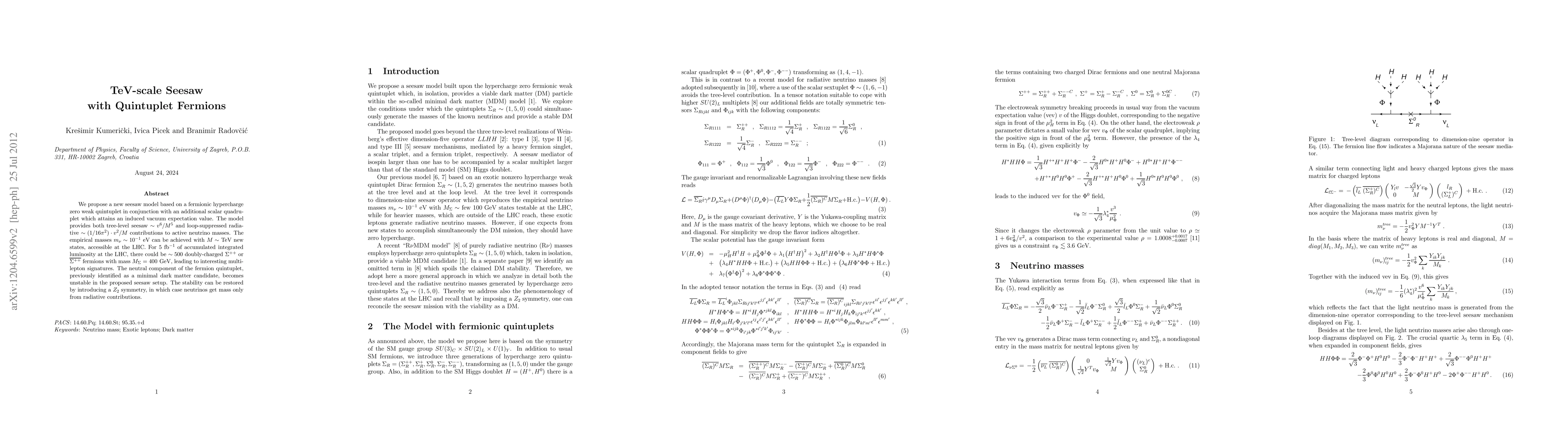 We propose a new seesaw model based on fermionic hypercharge zero weak quintuplet in conjunction with additional scalar quadruplet which attains an induced vev. The model provides both tree-level seesaw ~ v^6/M^5 and a loop-suppressed radiative ~ (1 / 16 \pi^2) v^2/M contributions to active neutrino masses. The empirical masses m_\nu ~ 10^{-1} eV can be achieved with M ~ TeV new states, accessible at the LHC. For 5 fb^{-1} of accumulated integrated luminosity at the LHC, there could be ~ 500 doubly-charged \Sigma^{++} or \bar{\Sigma^{++}} fermions with mass M_\Sigma = 400 GeV, leading to interesting multi-lepton signatures. The neutral component of the fermion quintuplet, previously identified as minimal dark matter candidate, becomes unstable in the proposed seesaw setup. The stability can be restored by introducing a Z_2 symmetry, in which case neutrinos get mass only from radiative contributions.