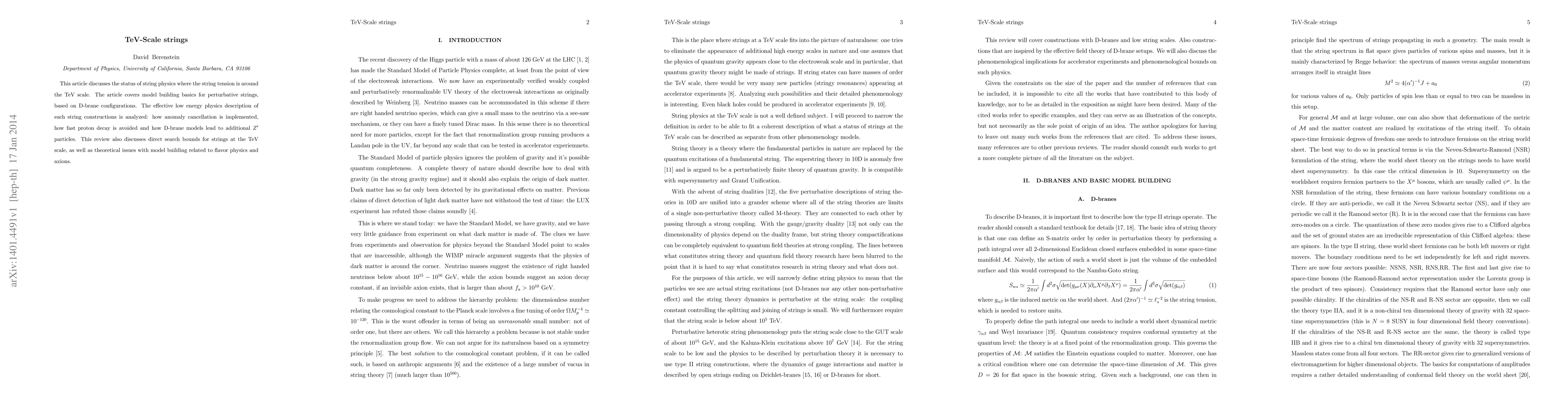 This paper reviews string physics at the TeV scale, discussing model building, anomaly cancellation, proton decay avoidance, and implications for flavor physics and axions.