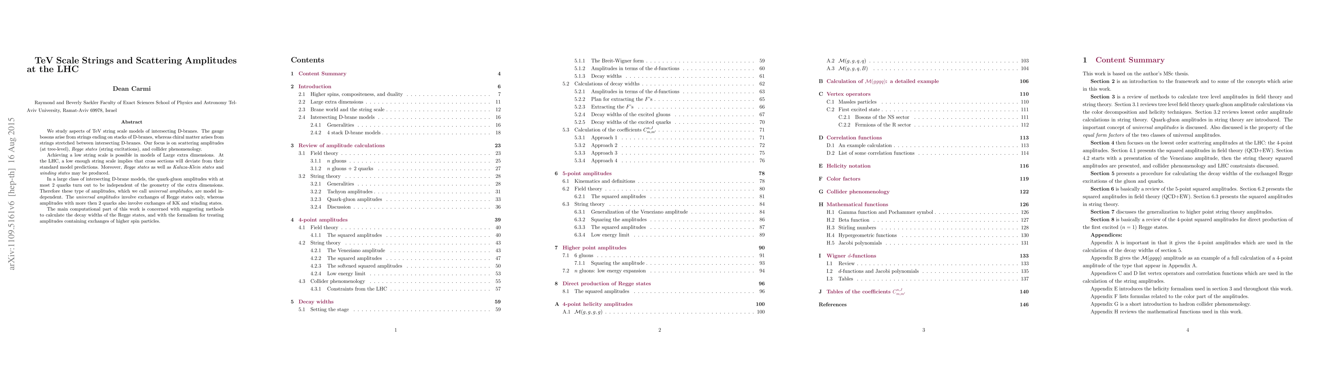 We study aspects of TeV string scale models of intersecting D-branes. The gauge bosons arise from strings ending on stacks of D-branes, whereas chiral matter arises from strings stretched between intersecting D-branes. Our focus is on scattering amplitudes (at tree-level), Regge states (string excitations), and collider phenomenology. Achieving a low string scale is possible in models of Large extra dimensions. At the LHC, a low enough string scale implies that cross sections will deviate from their standard model predictions. Moreover, Regge states as well as Kaluza-Klein states and winding states may be produced. In a large class of intersecting D-brane models, the quark-gluon amplitudes with at most 2 quarks turn out to be independent of the geometry of the extra dimensions. Therefore these type of amplitudes, which we call "universal amplitudes", are model independent. The universal amplitudes involve exchanges of Regge states only, whereas amplitudes with more then 2 quarks also involve exchanges of KK and winding states. The main computational part of this work is concerned with suggesting methods to calculate the decay widths of the Regge states, and with the formalism for treating amplitudes containing exchanges of higher spin particles.