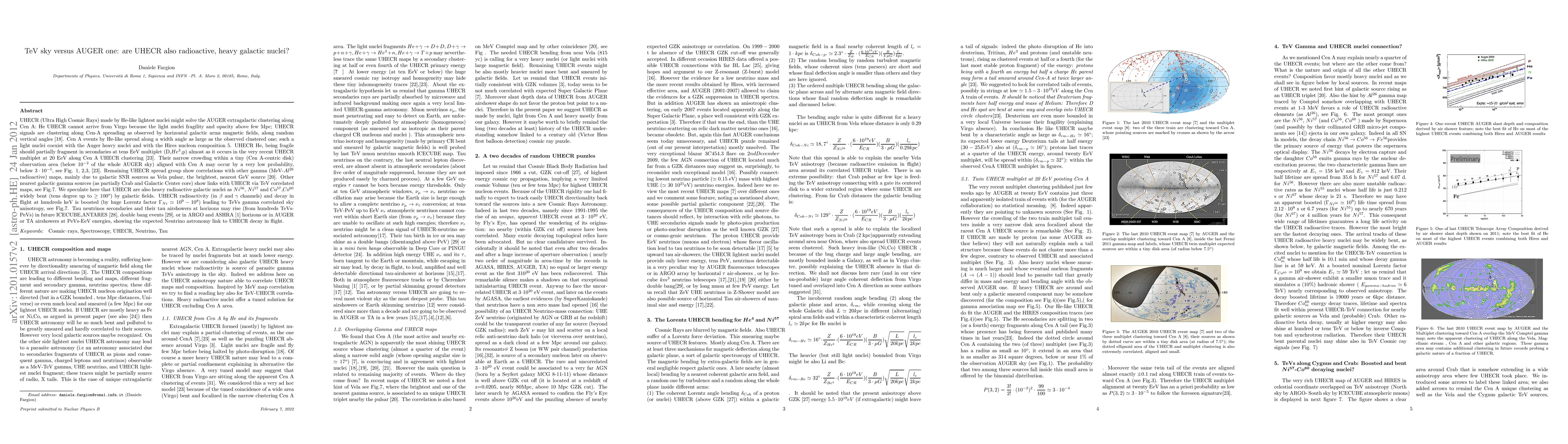 UHECR (Ultra High Cosmic Rays) made by He-like lightest nuclei might solve the AUGER extragalactic clustering along Cen A: He UHECR cannot arrive from Virgo because the light nuclei fragility and opacity above few Mpc; UHECR signals are clustering along Cen-A spreading as observed by horizontal galactic arms magnetic fields, along random vertical angles [18]. Cen A events by He-like spread along a width angle as large as the observed clustered one. UHECR He, being fragile should partially fragment in secondaries at tens EeV multiplet (D,He3,p) almost as it occurs in the very recent UHECR multiplet at 20 EeV along Cen A UHECR clustering [23]. Their narrow crowding within a tiny (Cen A centric disk) observation area (below 10^{-2} of the whole AUGER sky) aligned with Cen A may occur by a very low probability, below 3 \dot 10^{-5}, see Fig. 1, 2,3, [23]. Remaining UHECR spread group show correlations with other gamma (MeV-Al^26 radioactive) maps, mainly due to galactic SNR sources as Vela pulsar, the brightest, nearest GeV source [20]. Other nearest galactic gamma sources (as partially Crab and Galactic Center core) show links with UHECR via TeV correlated maps, see Fig.7. We speculate here that UHECR are also heavy radioactive galactic nuclei as Ni^56, Ni^57 and Co^57,Co^60 widely bent (tens degree up to \geq 100{\deg}) by galactic fields. UHECR radioactivity (in beta,gamma channels) decay in flight at hundreds keV is boosted (by huge Lorentz factor \simeq 10^9 - 10^8) leading to TeVs gamma correlated sky anisotropy, see Fig.7. Tau neutrinos secondaries and their tau airshowers at horizons may rise (from hundreds TeVs-PeVs) in future ICECUBE,ANTARES [28], double bang events [29], or in ARGO and ASHRA [1] horizons or in AUGER or TA airshowers at PeVs-EeV energies, showing the expected Neutrino astronomy link to UHECR decay in flight.