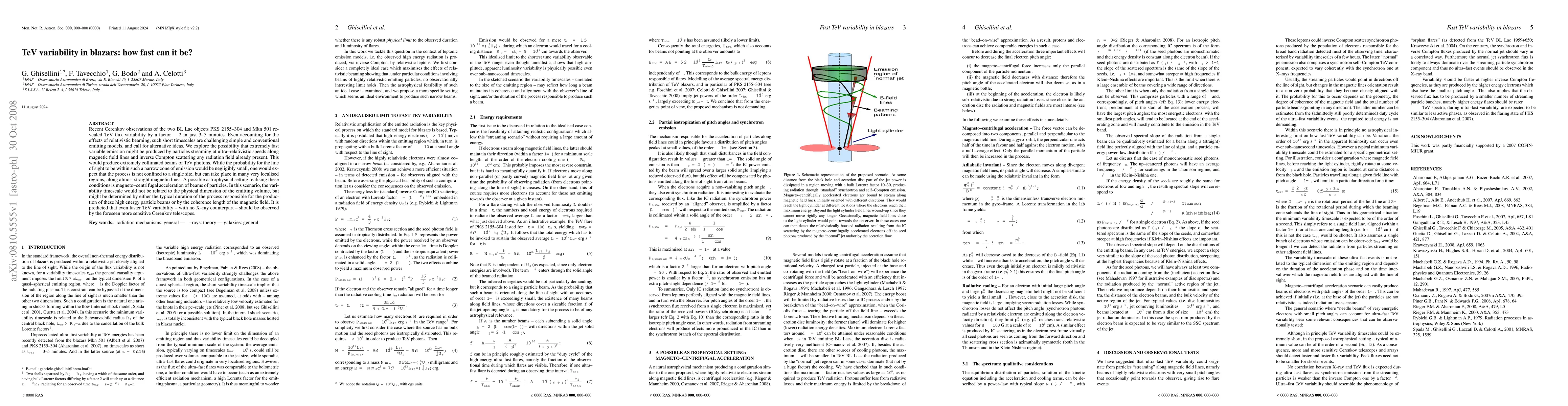 Recent Cerenkov observations of the two BL Lac objects PKS 2155-304 and Mkn 501 revealed TeV flux variability by a factor ~2 in just 3-5 minutes. Even accounting for the effects of relativistic beaming, such short timescales are challenging simple and conventional emitting models, and call for alternative ideas. We explore the possibility that extremely fast variable emission might be produced by particles streaming at ultra-relativistic speeds along magnetic field lines and inverse Compton scattering any radiation field already present. This would produce extremely collimated beams of TeV photons. While the probability for the line of sight to be within such a narrow cone of emission would be negligibly small, one would expect that the process is not confined to a single site, but can take place in many very localised regions, along almost straight magnetic lines. A possible astrophysical setting realising these conditions is magneto-centrifugal acceleration of beams of particles. In this scenario, the variability timescale would not be related to the physical dimension of the emitting volume, but might be determined by either the typical duration of the process responsible for the production of these high energy particle beams or by the coherence length of the magnetic field. It is predicted that even faster TeV variability - with no X-ray counterpart - should be observed by the foreseen more sensitive Cerenkov telescopes.
