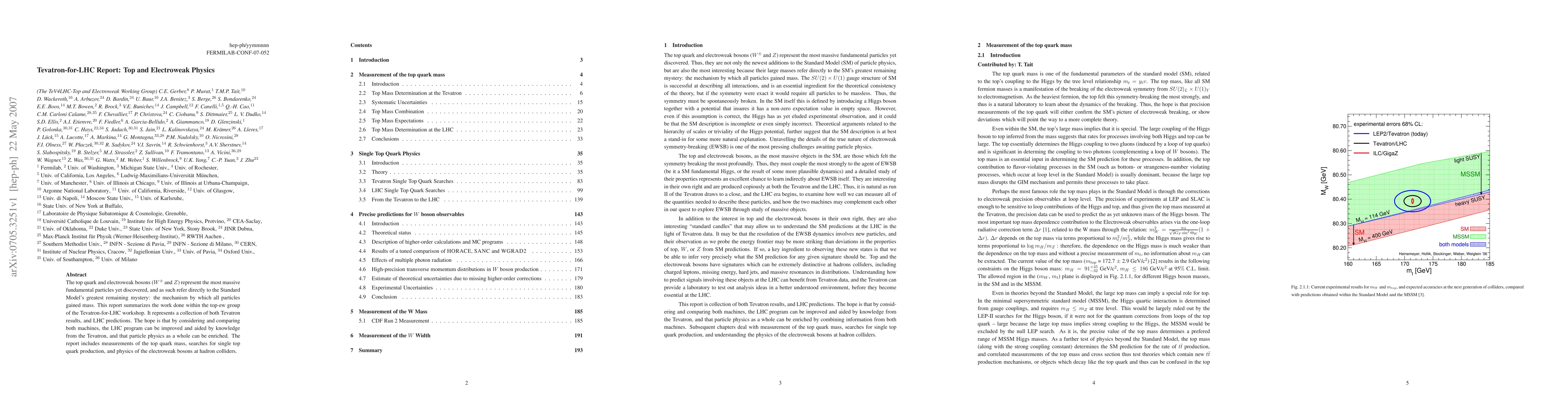 This report synthesizes Tevatron results and LHC predictions on top quarks and electroweak bosons, aiming to enhance the understanding of mass generation mechanisms and improve the LHC program by leveraging Tevatron insights. It covers top quark mass measurements, single top quark production searches, and electroweak boson physics.