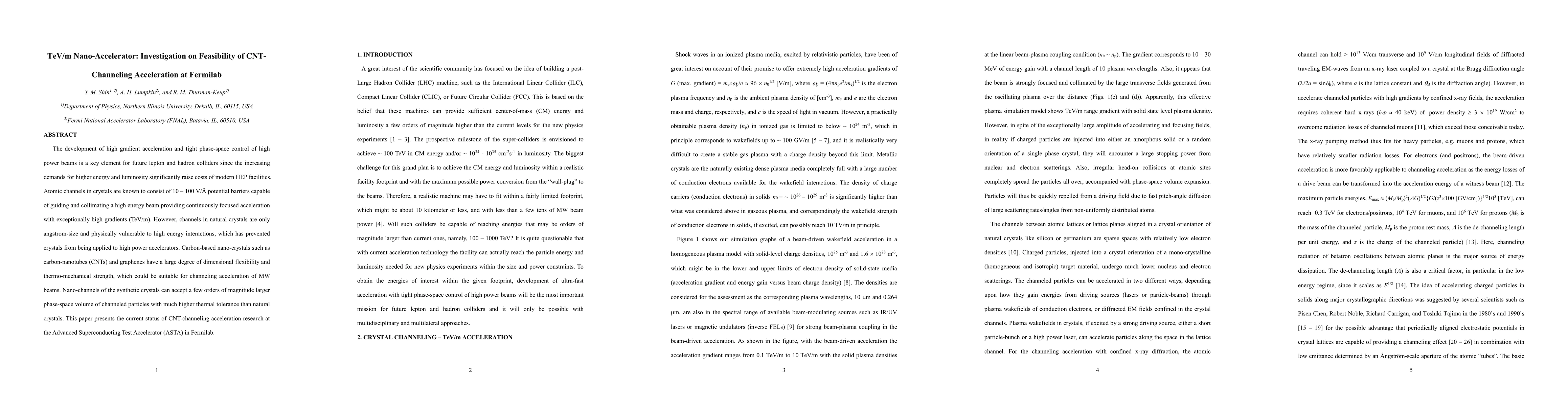 This paper investigates the feasibility of using carbon nanotubes (CNTs) for high-gradient acceleration in a nano-accelerator at Fermilab, exploring their potential to provide TeV/m acceleration with superior phase-space control and thermal tolerance compared to natural crystals. The study highlights ongoing research at the Advanced Superconducting Test Accelerator (ASTA) to develop this novel acceleration technique.