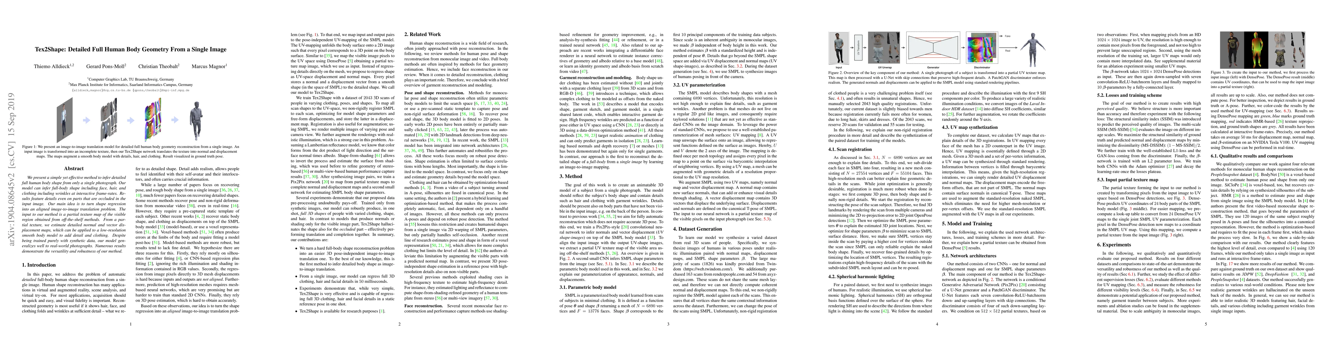 Tex2Shape is a method that infers detailed full human body geometry from a single image by treating shape regression as an aligned image-to-image translation problem. It generates normal and displacement maps from a partial texture map, which are applied to a low-resolution body model to produce detailed and realistic full-body shapes, even for occluded parts.