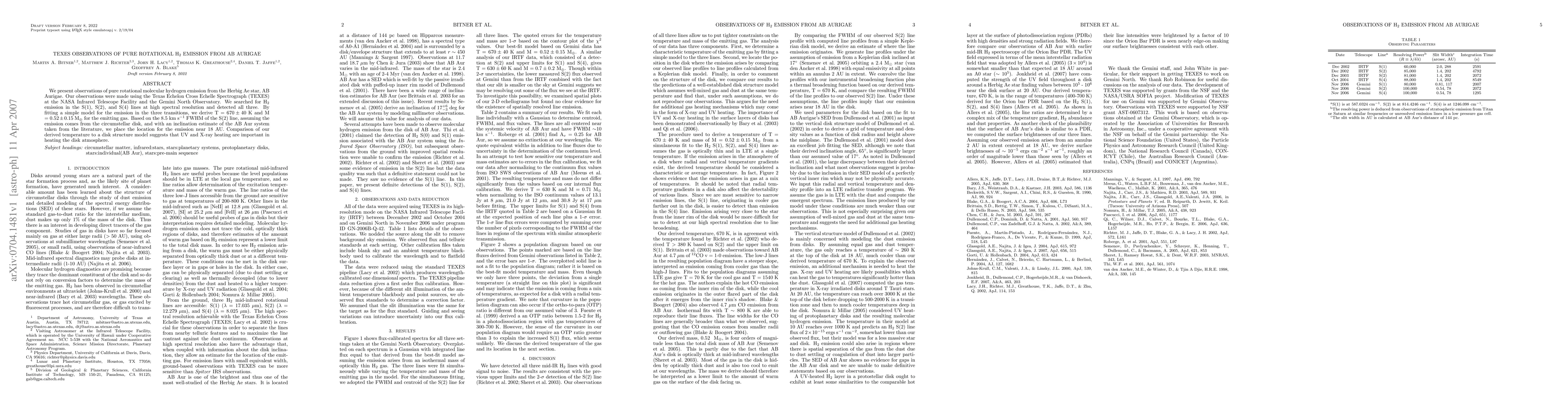This study uses TEXES observations to detect pure rotational H2 emission lines from AB Aurigae, revealing a temperature of 670 +/- 40 K and a mass of 0.52 +/- 0.15 earth masses for the emitting gas. The emission likely originates from the circumstellar disk at approximately 18 AU, suggesting significant UV and X-ray heating.