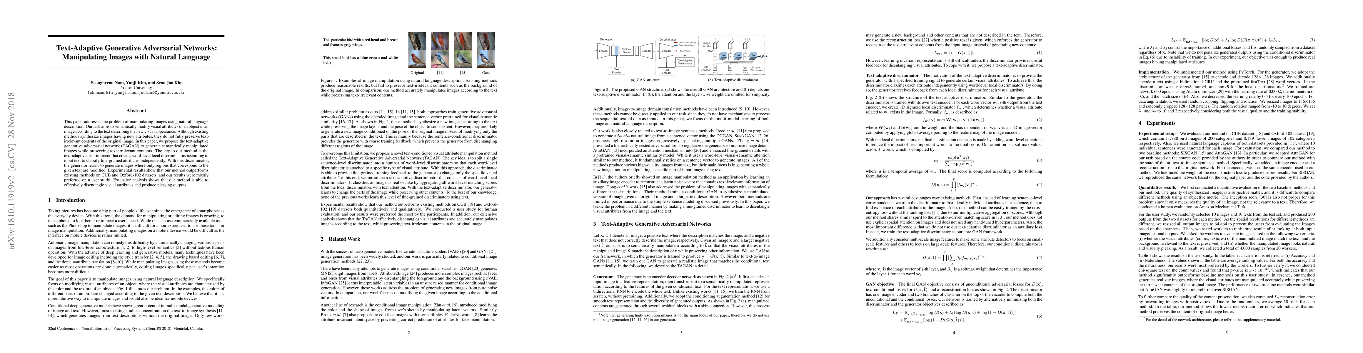 This paper introduces the text-adaptive generative adversarial network (TAGAN) to modify image attributes based on natural language descriptions while preserving irrelevant details. TAGAN's text-adaptive discriminator enables fine-grained attribute classification, leading to superior results on CUB and Oxford-102 datasets.