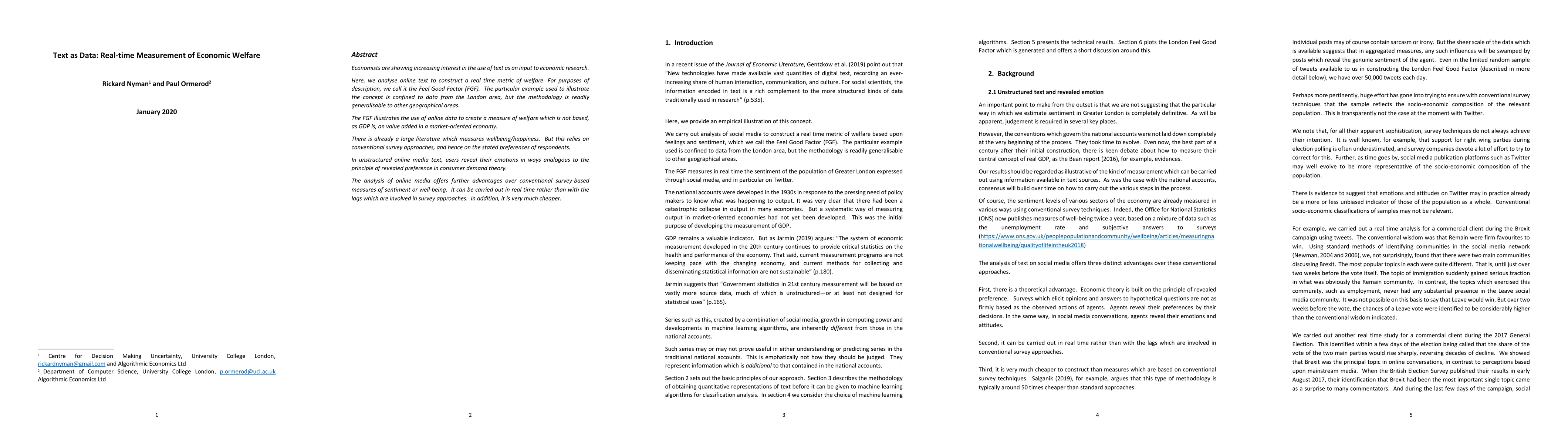 Economists are showing increasing interest in the use of text as an input to economic research. Here, we analyse online text to construct a real time metric of welfare. For purposes of description, we call it the Feel Good Factor (FGF). The particular example used to illustrate the concept is confined to data from the London area, but the methodology is readily generalisable to other geographical areas. The FGF illustrates the use of online data to create a measure of welfare which is not based, as GDP is, on value added in a market-oriented economy. There is already a large literature which measures wellbeing/happiness. But this relies on conventional survey approaches, and hence on the stated preferences of respondents. In unstructured online media text, users reveal their emotions in ways analogous to the principle of revealed preference in consumer demand theory. The analysis of online media offers further advantages over conventional survey-based measures of sentiment or well-being. It can be carried out in real time rather than with the lags which are involved in survey approaches. In addition, it is very much cheaper.