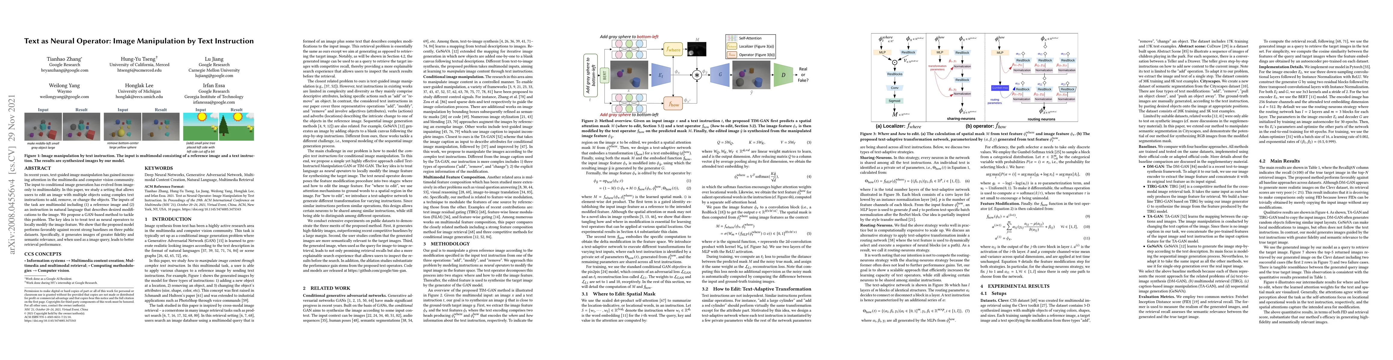In recent years, text-guided image manipulation has gained increasing attention in the multimedia and computer vision community. The input to conditional image generation has evolved from image-only to multimodality. In this paper, we study a setting that allows users to edit an image with multiple objects using complex text instructions to add, remove, or change the objects. The inputs of the task are multimodal including (1) a reference image and (2) an instruction in natural language that describes desired modifications to the image. We propose a GAN-based method to tackle this problem. The key idea is to treat text as neural operators to locally modify the image feature. We show that the proposed model performs favorably against recent strong baselines on three public datasets. Specifically, it generates images of greater fidelity and semantic relevance, and when used as a image query, leads to better retrieval performance.