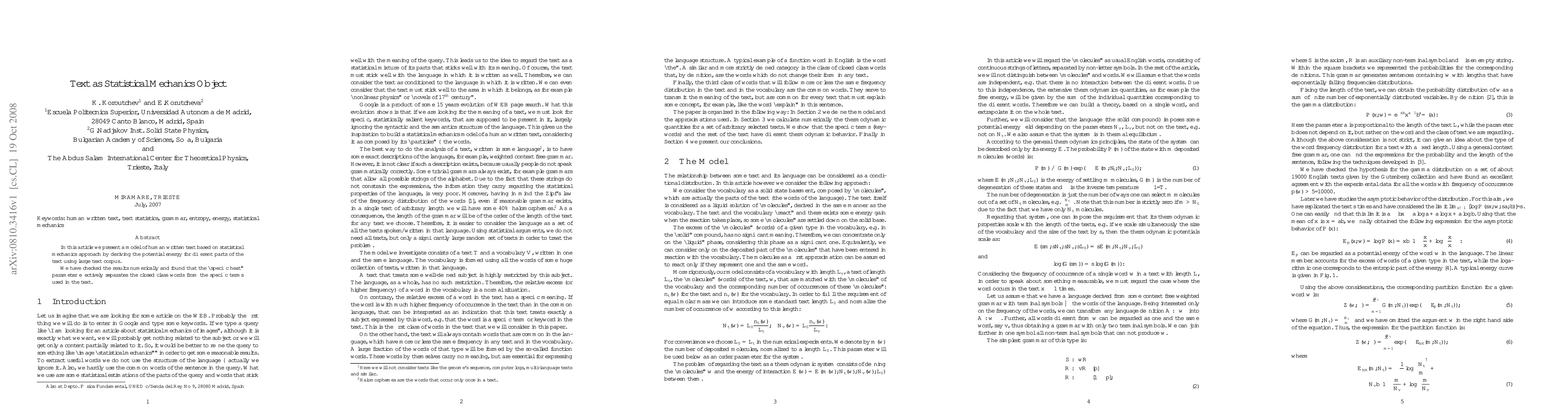 In this article we present a model of human written text based on statistical mechanics approach by deriving the potential energy for different parts of the text using large text corpus. We have checked the results numerically and found that the specific heat parameter effectively separates the closed class words from the specific terms used in the text.