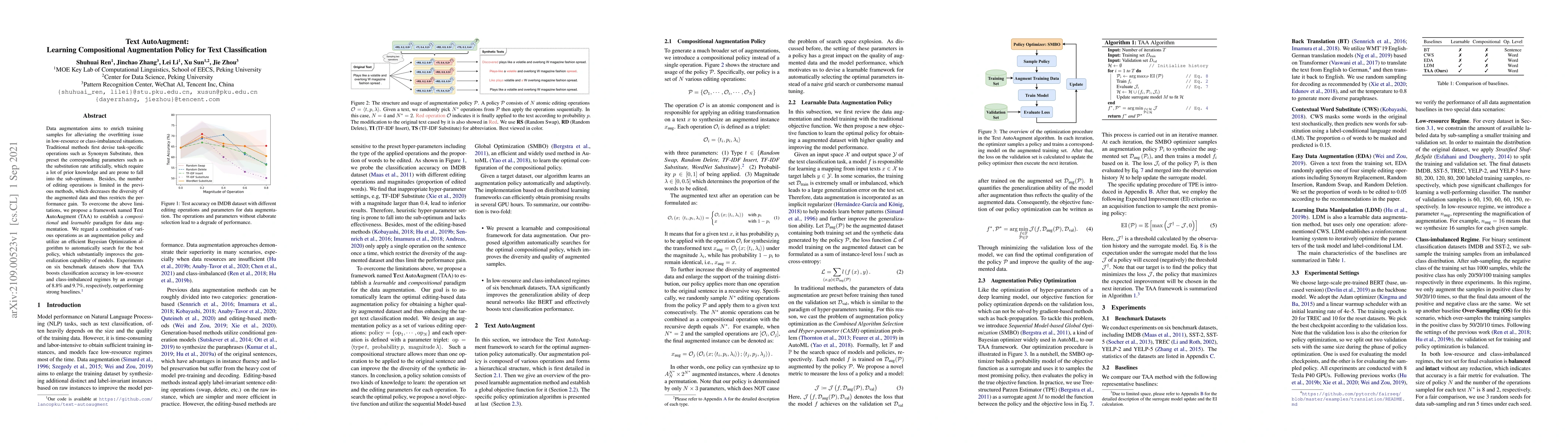 Text AutoAugment (TAA) proposes a framework for learning compositional augmentation policies to enhance text classification, employing Bayesian Optimization to automatically discover optimal augmentation strategies. This approach significantly improves model performance in low-resource and class-imbalanced settings, achieving an average accuracy boost of 8.8% and 9.7%, respectively.