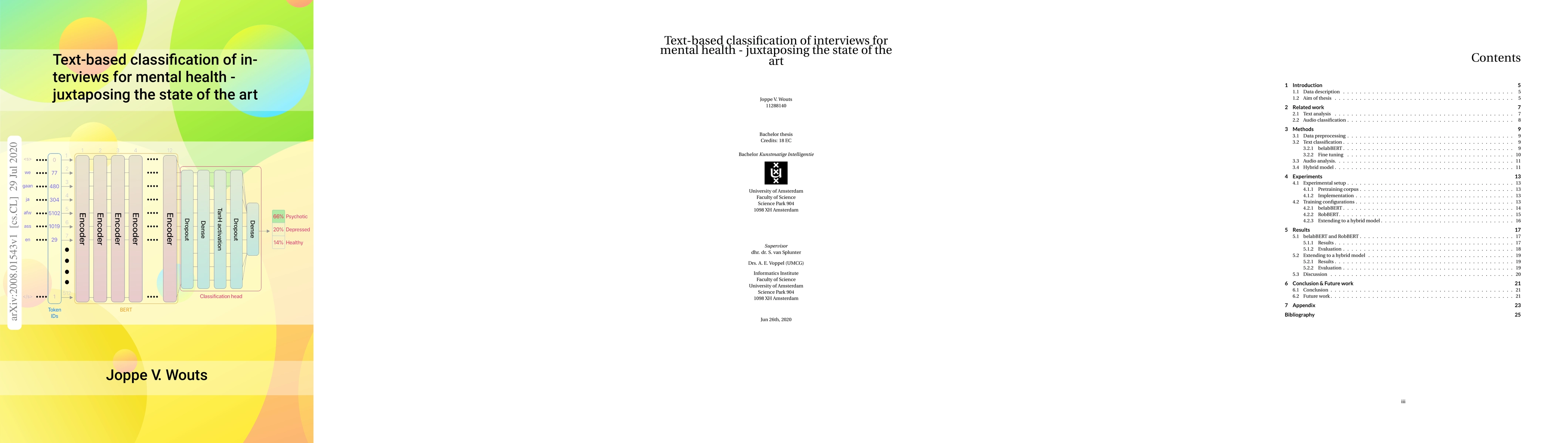Currently, the state of the art for classification of psychiatric illness is based on audio-based classification. This thesis aims to design and evaluate a state of the art text classification network on this challenge. The hypothesis is that a well designed text-based approach poses a strong competition against the state-of-the-art audio based approaches. Dutch natural language models are being limited by the scarcity of pre-trained monolingual NLP models, as a result Dutch natural language models have a low capture of long range semantic dependencies over sentences. For this issue, this thesis presents belabBERT, a new Dutch language model extending the RoBERTa[15] architecture. belabBERT is trained on a large Dutch corpus (+32GB) of web crawled texts. After this thesis evaluates the strength of text-based classification, a brief exploration is done, extending the framework to a hybrid text- and audio-based classification. The goal of this hybrid framework is to show the principle of hybridisation with a very basic audio-classification network. The overall goal is to create the foundations for a hybrid psychiatric illness classification, by proving that the new text-based classification is already a strong stand-alone solution.