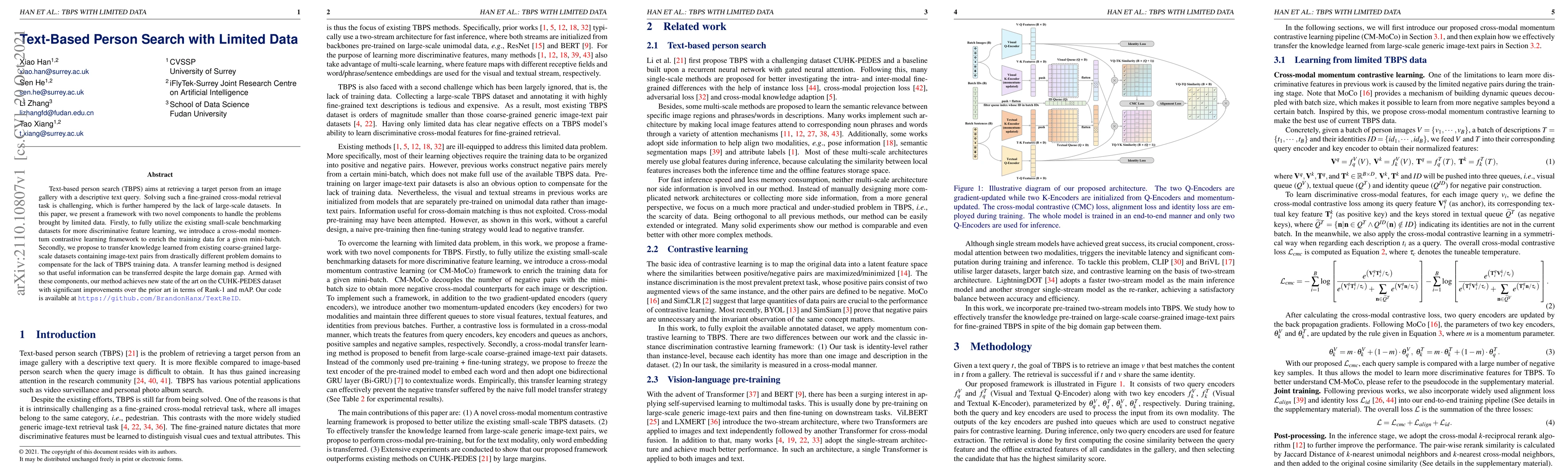 This paper introduces a framework for text-based person search using limited data, employing cross-modal momentum contrastive learning to enhance feature learning and transfer learning to leverage large-scale datasets from different domains. The proposed method achieves state-of-the-art results on the CUHK-PEDES dataset.