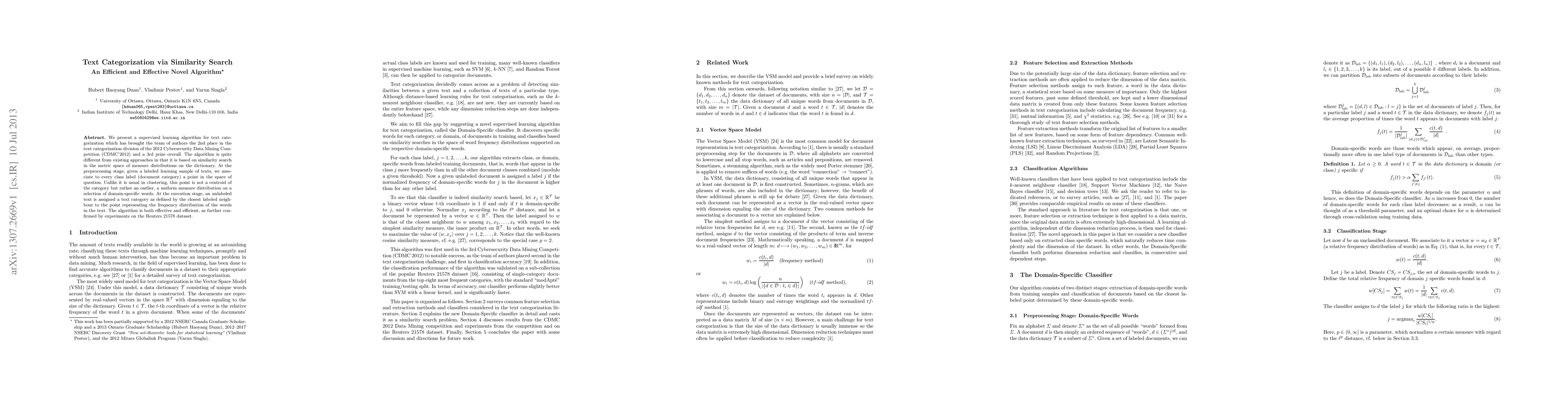 A novel algorithm for text categorization uses similarity search to assign categories to unlabeled texts based on their frequency distribution of domain-specific words. It achieved 2nd place in a competition using the Reuters 21578 dataset.